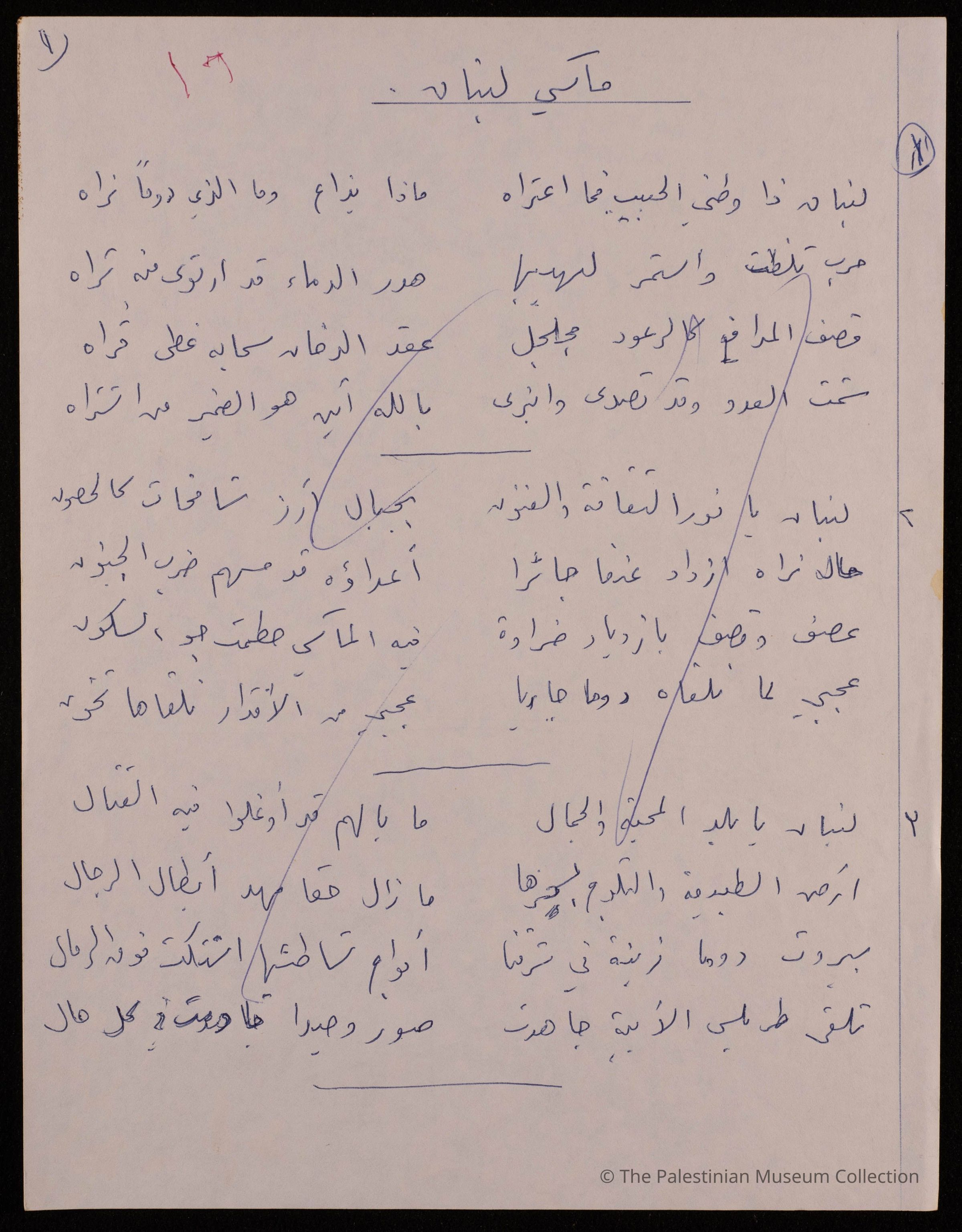 مخطوطة قصيدة باللغة العربية بعنوان" ماسي لبنان"للشاعرة فاطمة المحب، ولا تحمل الوثيقة اية اشارة الى تاريخ كتابتها.