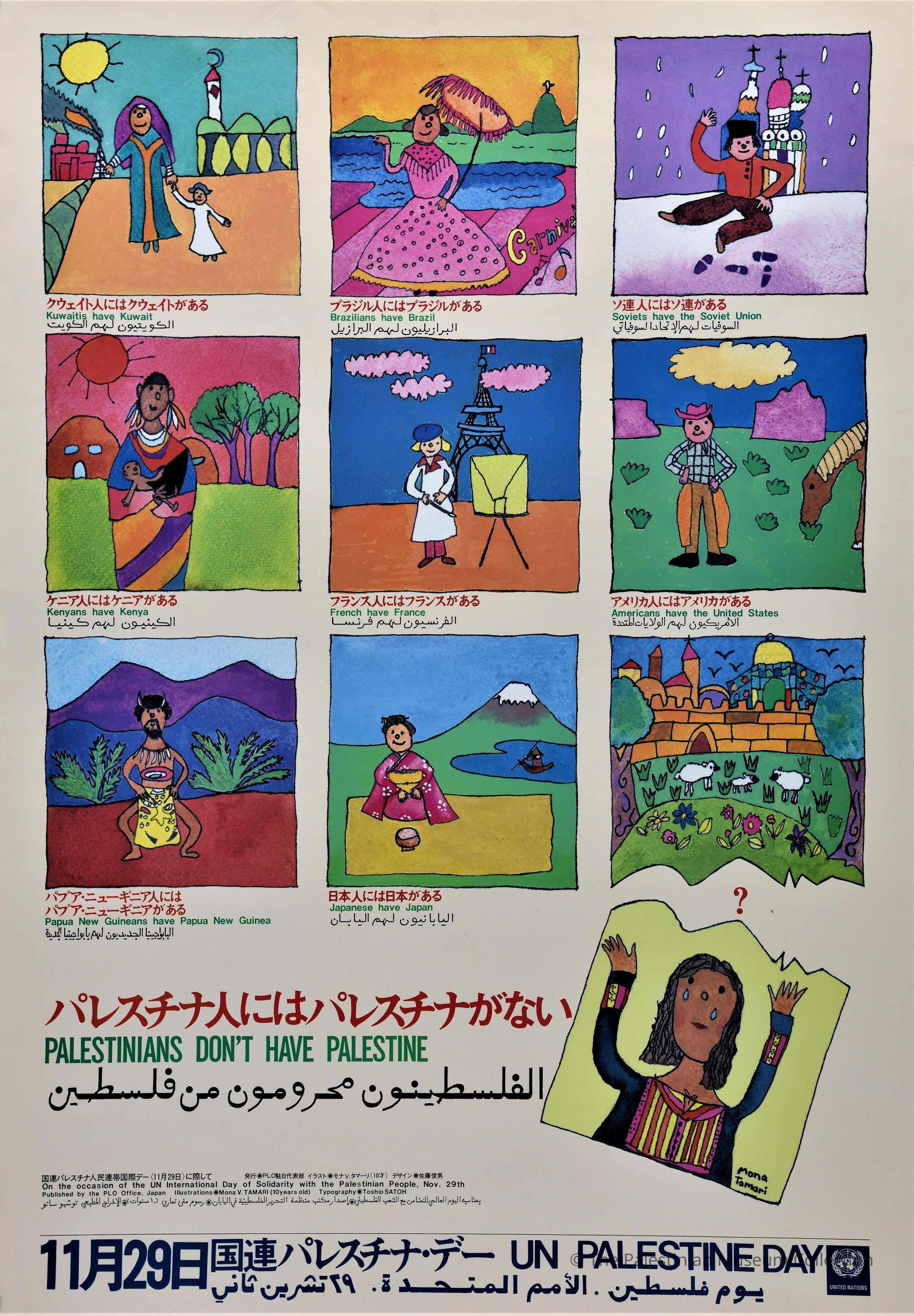 A colour poster showing drawings of happy children from all over the world; except a Palestinian who is denied his country.Dimensions