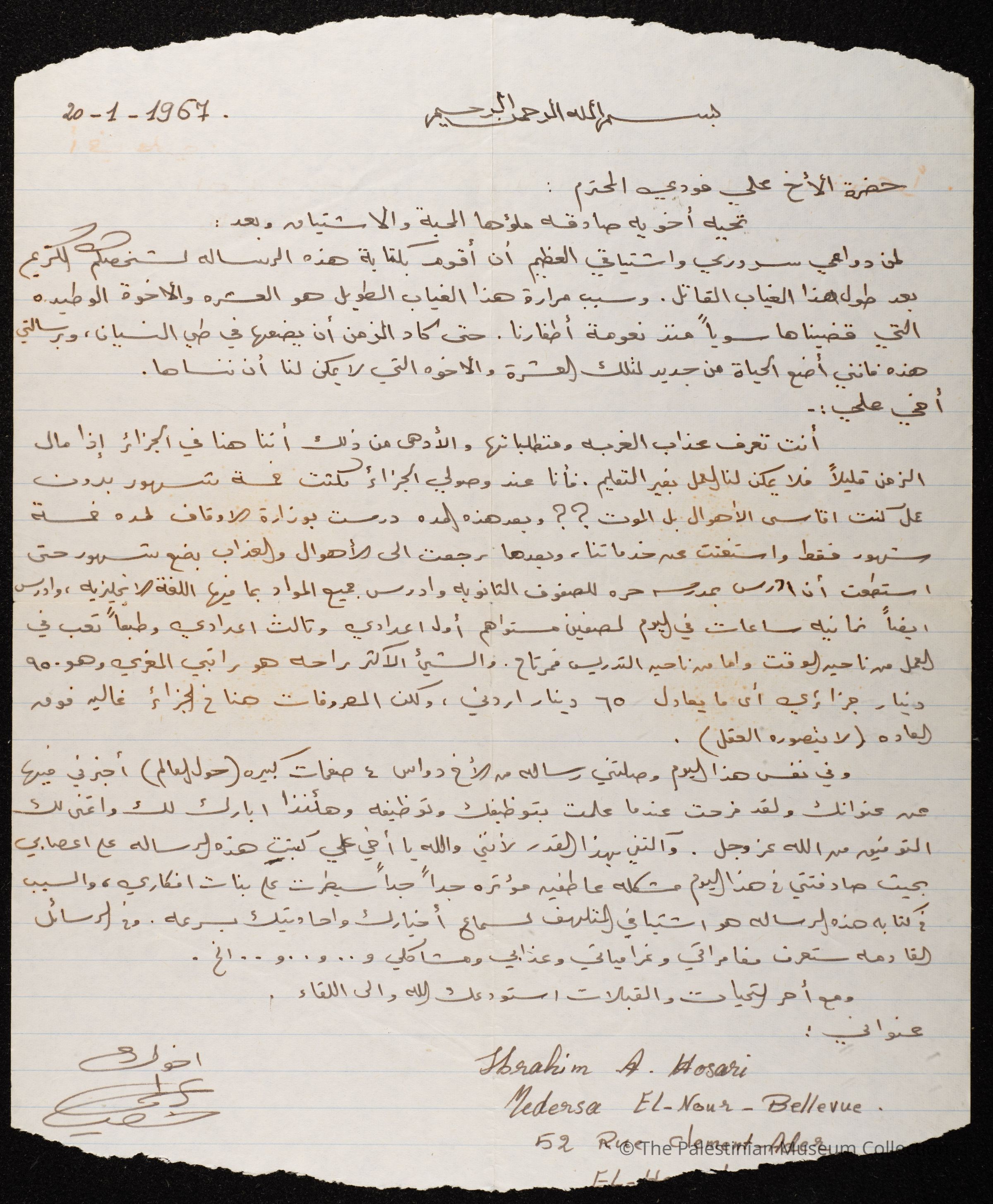 رسالة من الاخ ابراهيم حصري الى السيد علي فودة، تحتوي على اخبار واحوال المرسل في الغربة ويعبر فيها عن اشتياقه للسيد علي فودة,ويرسل تحياته له، وفيها ايضا وعنوان المرسل.