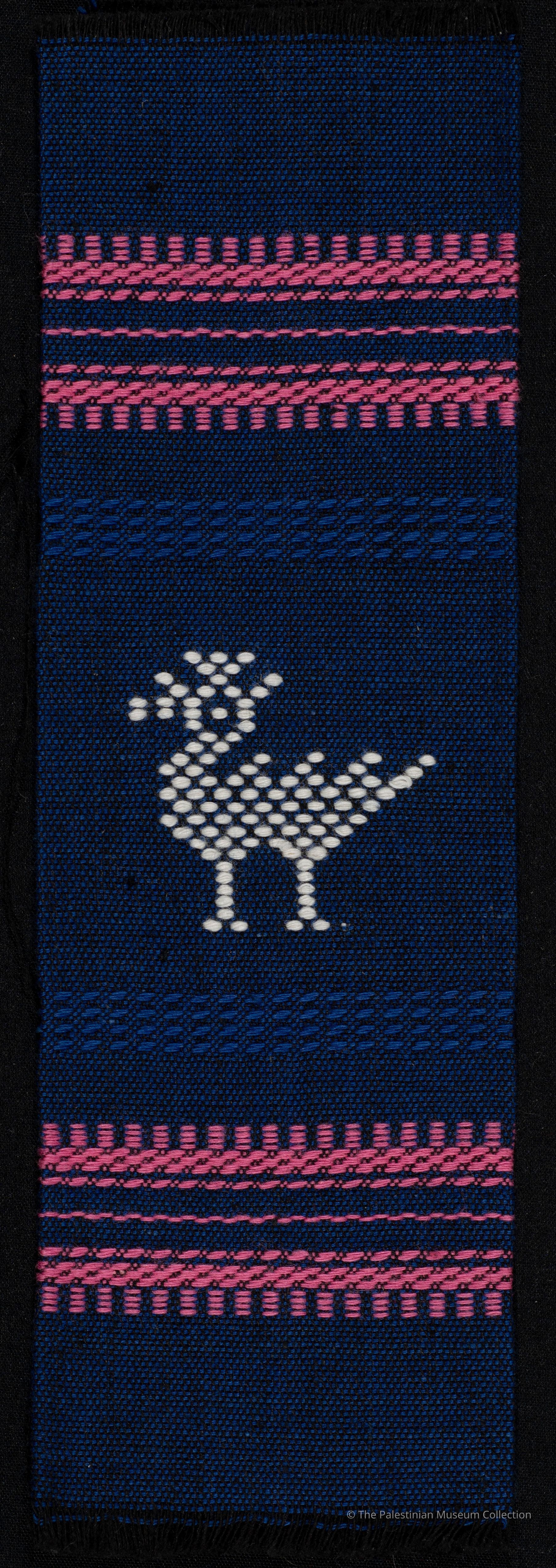 منديل سفرة من قماش الكتان باللون الكحلي، مربع الشكل، ومُطرّز بقطبة الصليب الفلاحية بخيوط حرير باللون الزهري والأزرق والأبيض بخطوط مستقيمة أُفقية وشكل بطة.