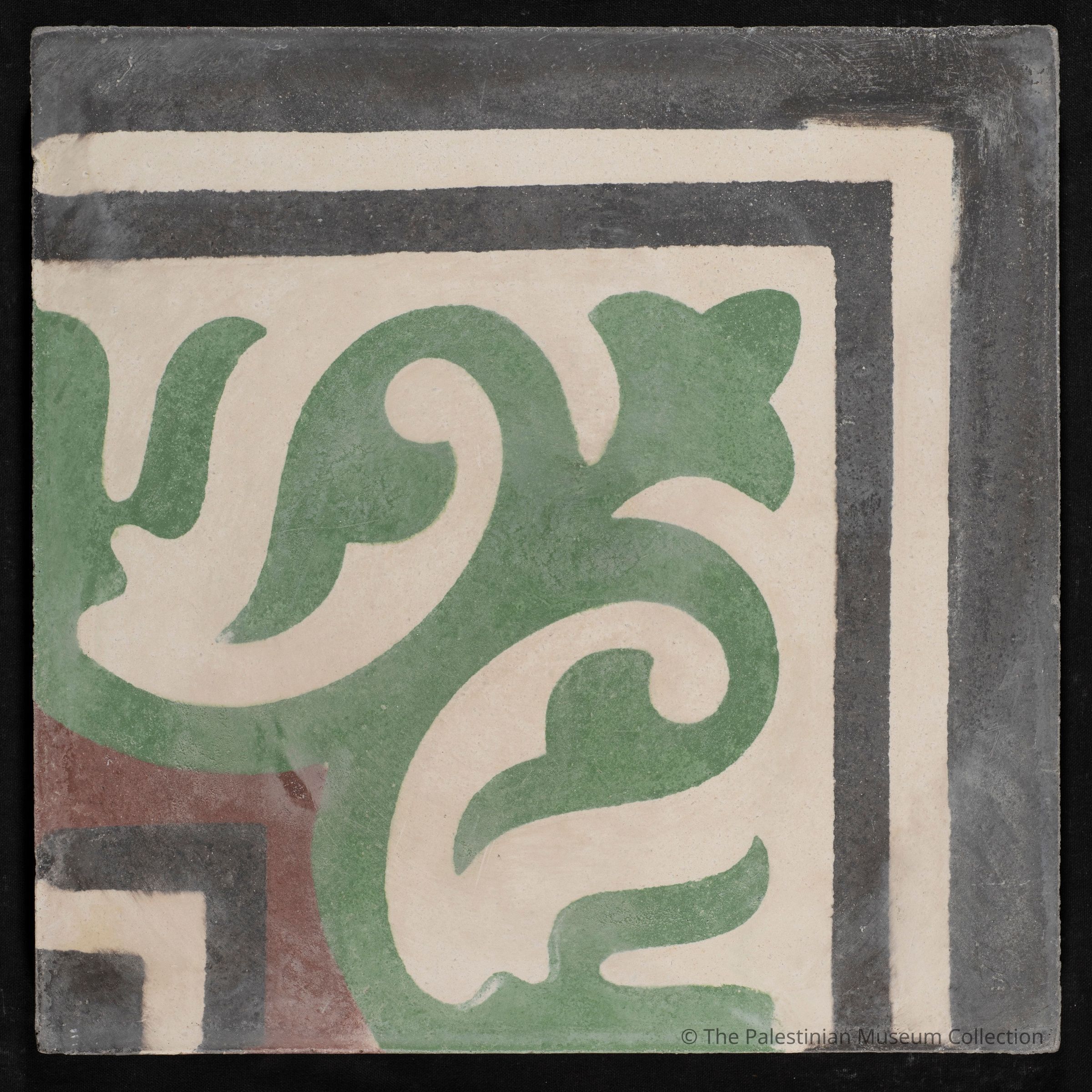 A 20 × 20 cm coloured cement corner tile of the Zunnar (border). This tile is a contemporary reproduction, cast using an original mold from the Aslan Tile Factory in Nablus.Made/Created