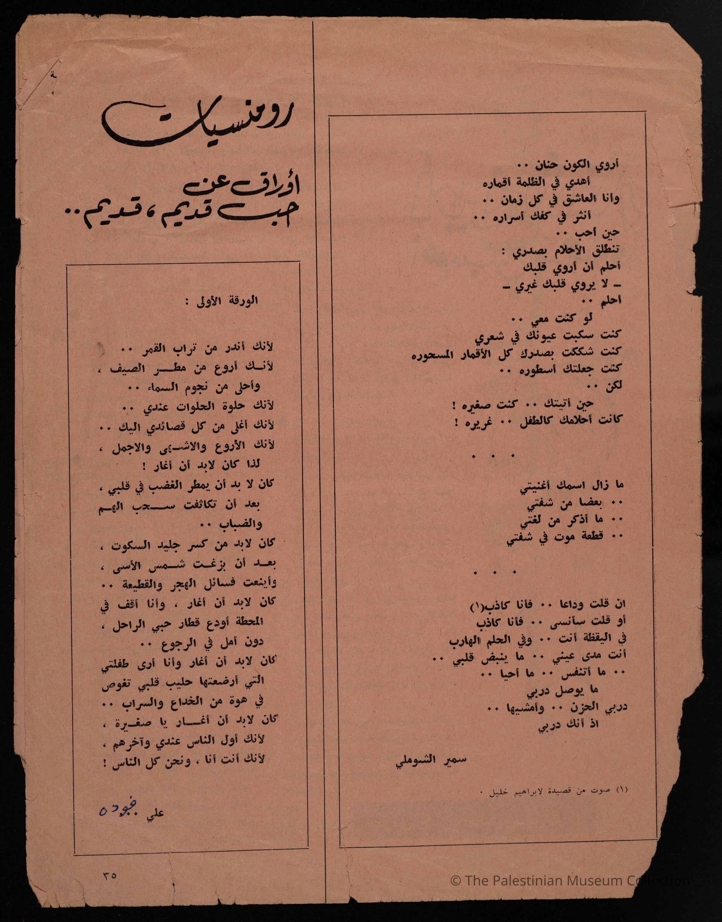 قصاصة من مجلة، وفي قسم الرومنسيات ، تحتوي على قصيدة "أوراق عن حب قديم، قديم..." للشاعر علي فودة بالاضافة الى مقالات اخرى.