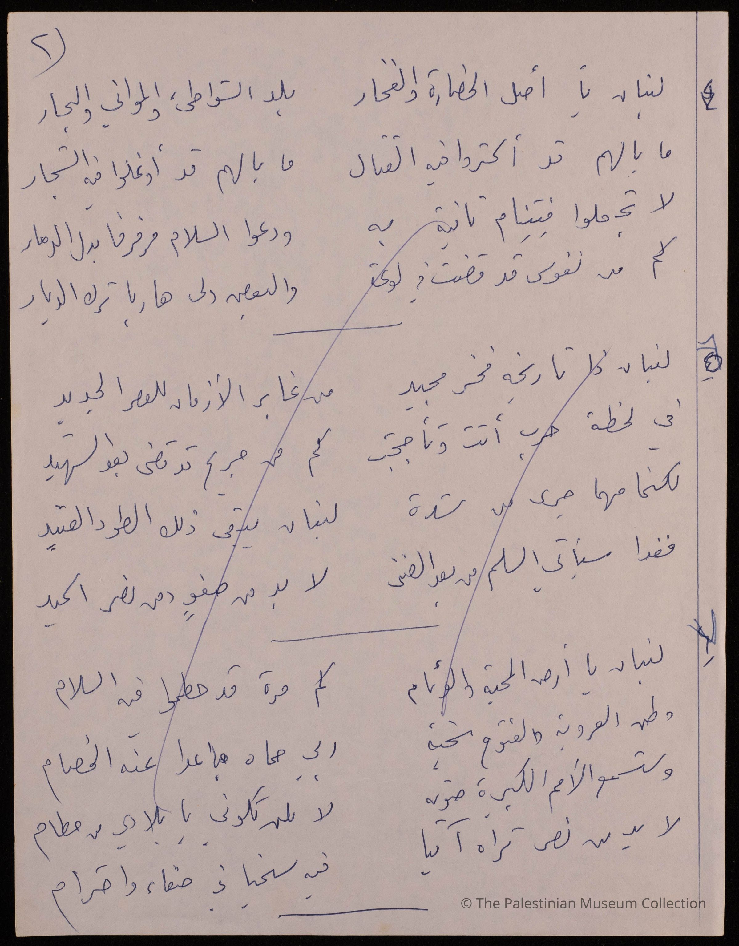 مخطوطة قصيدة باللغة العربية بعنوان "لبنان يا أصل الحضارة" للشاعرة فاطمة المحب ولا تحمل الوثيقة اي اشارة الى تاريخ كتابتها.