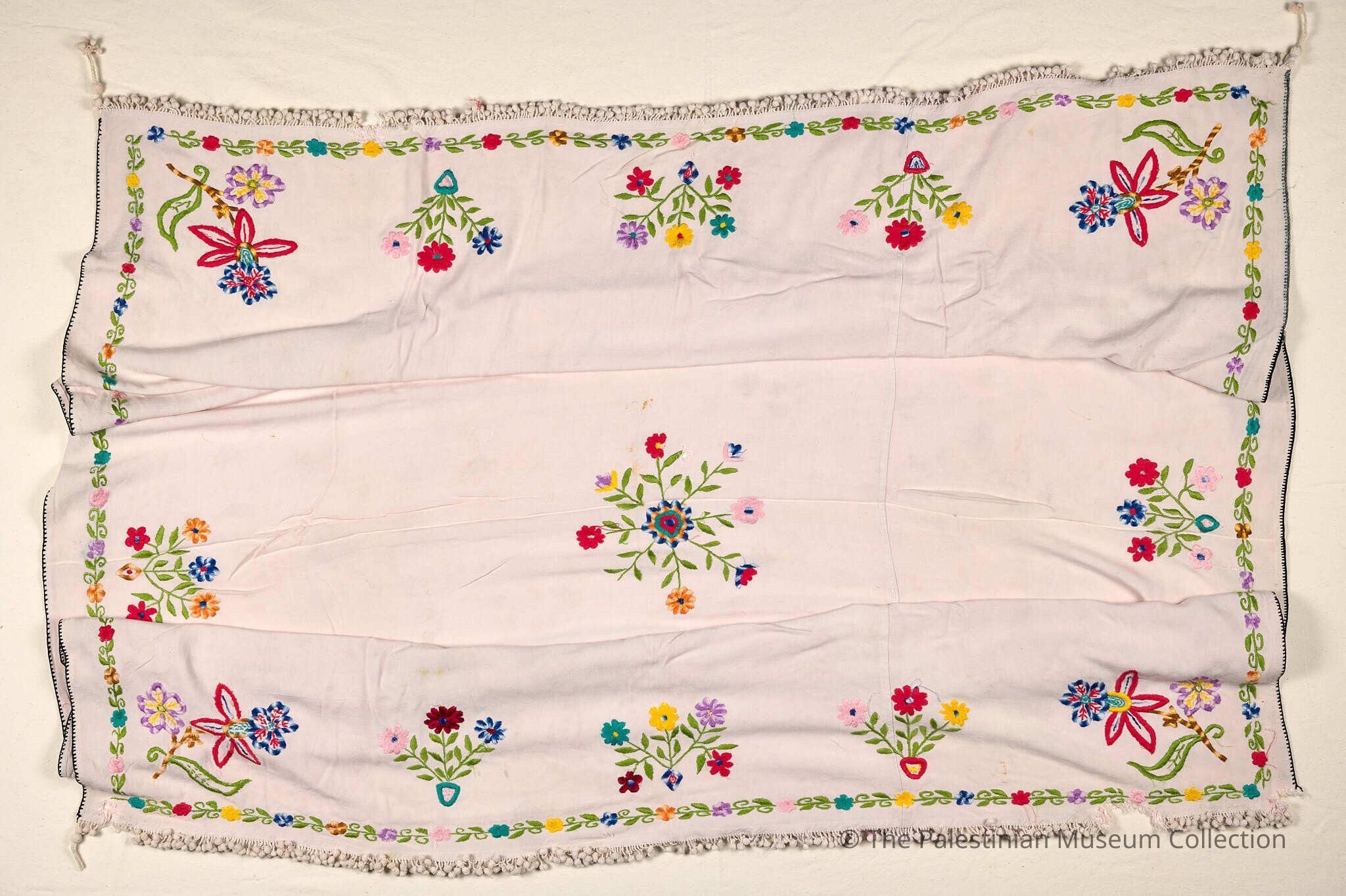 Ghudfah Shawl, a rectangular shawl from Hebron city which would be worn on the head. It is made of white cotton and embroidered with silk and cotton threads in plant shapes along with rose pot and rose motifs along with tassels dangling on its end.Made/Created