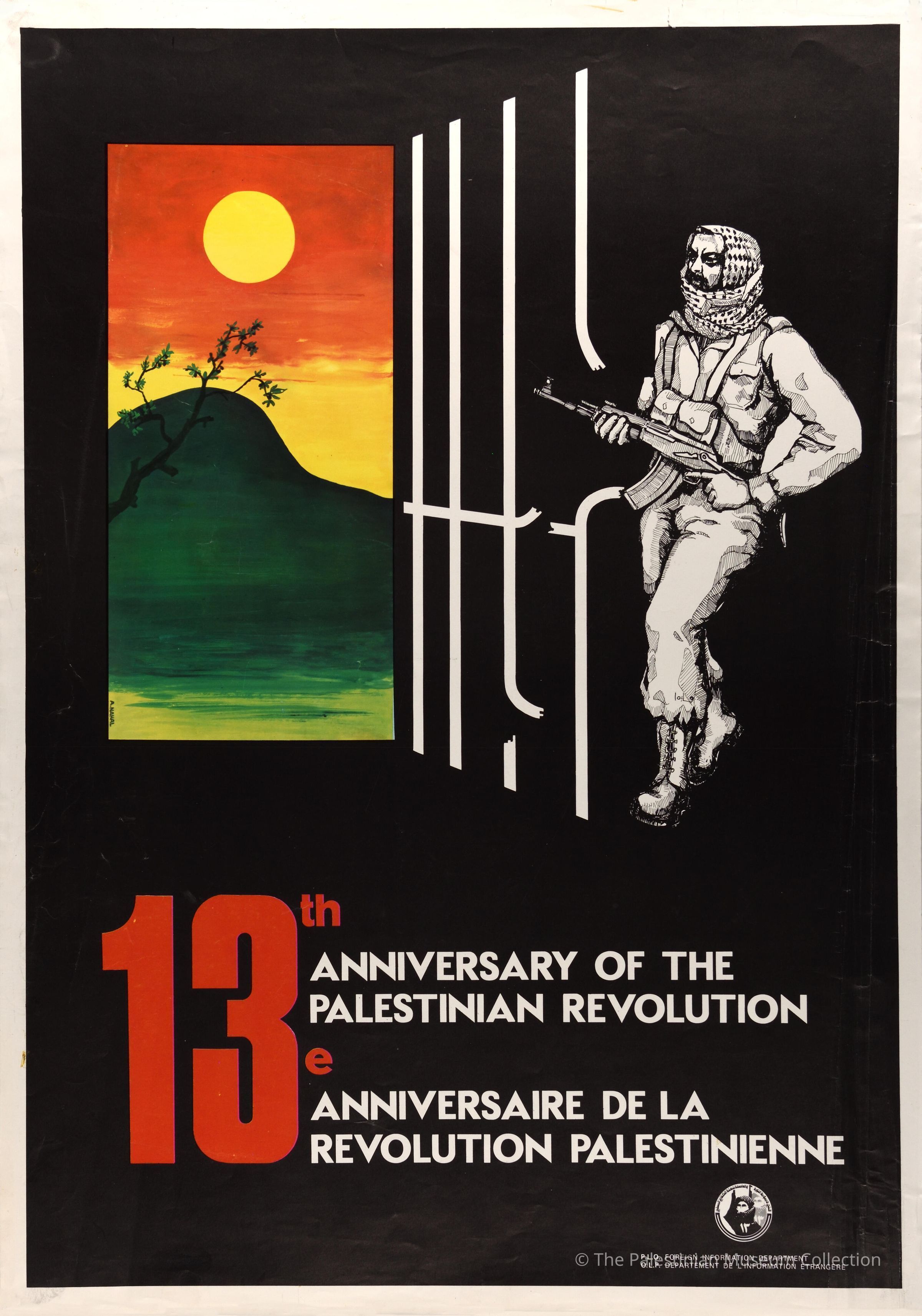 This poster was issued by the Unified Information Office of the Palestine Liberation Organisation (PLO) in 1978 in commemoration of the 13th anniversary of the Palestinian Revolution.Dimensions
