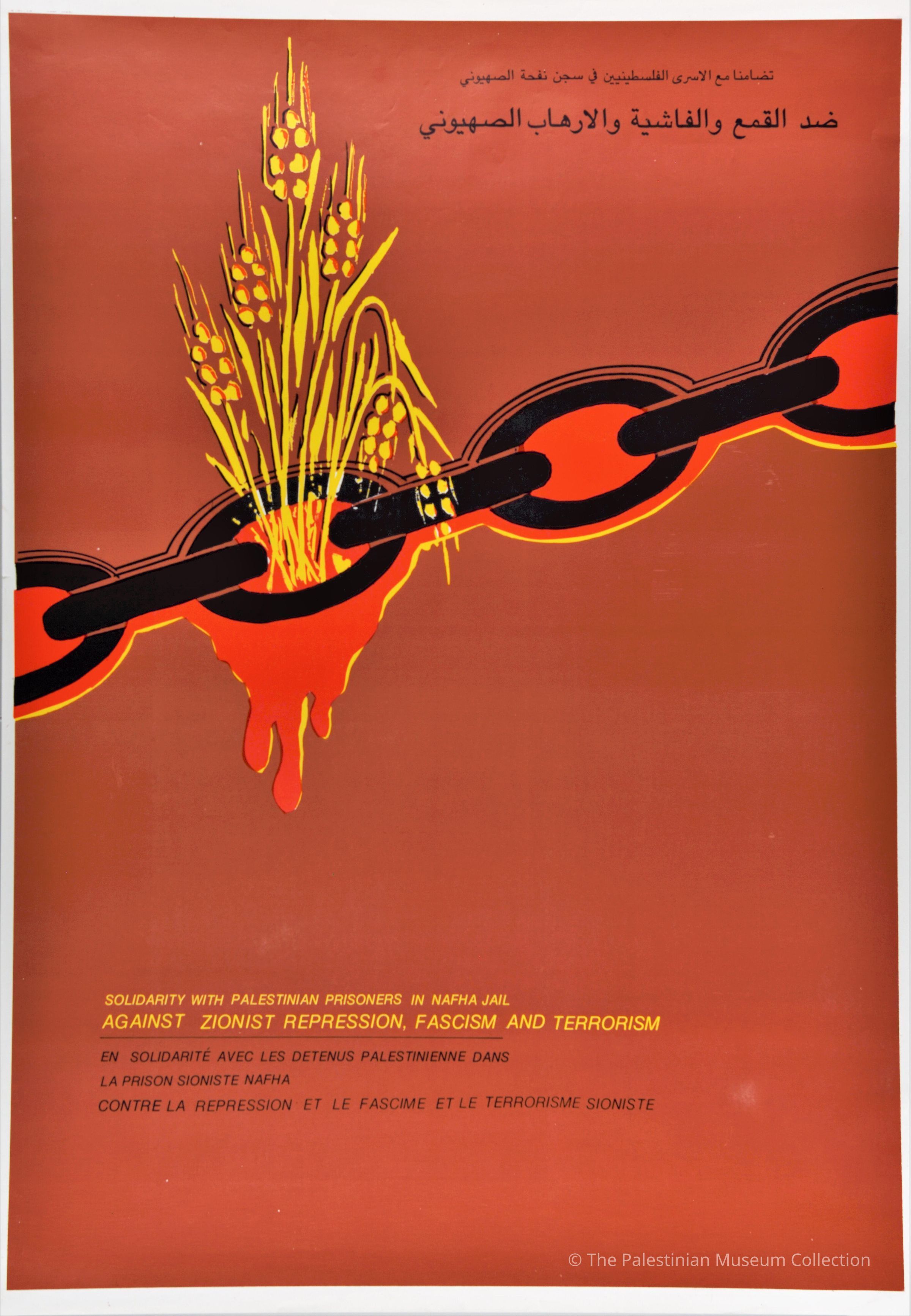 ملصق ملون، يظهر فيه سلسلة ينبت منها سنابل القمح تنزف دماً.