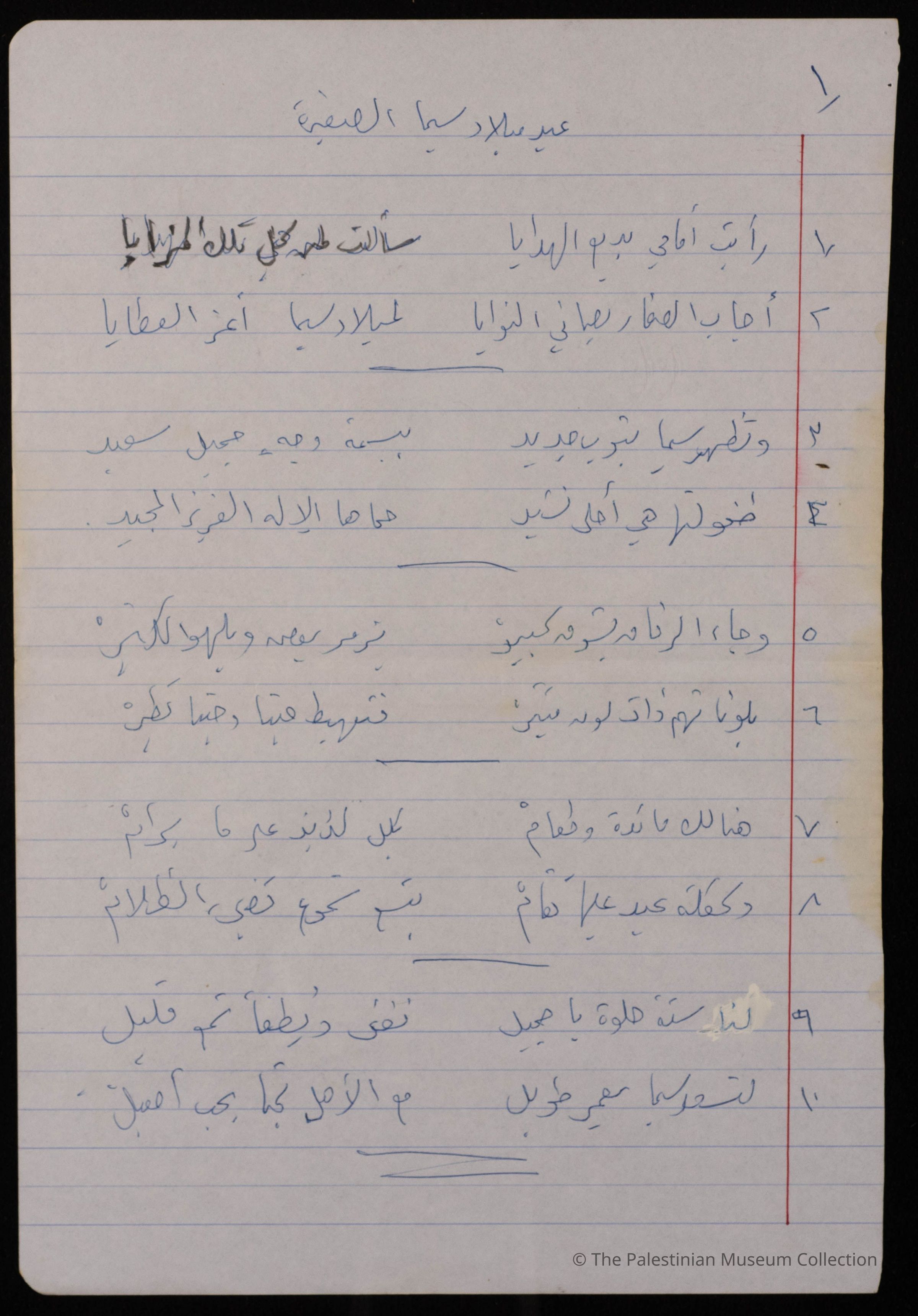 مخطوطة قصيدة باللغة العربية بعنوان" عيد ميلاد سيما الصغيرة" للشاعرة فاطمة المحب، ولا تحمل الوثيقة اية اشارة الى تاريخ كتابتها.
