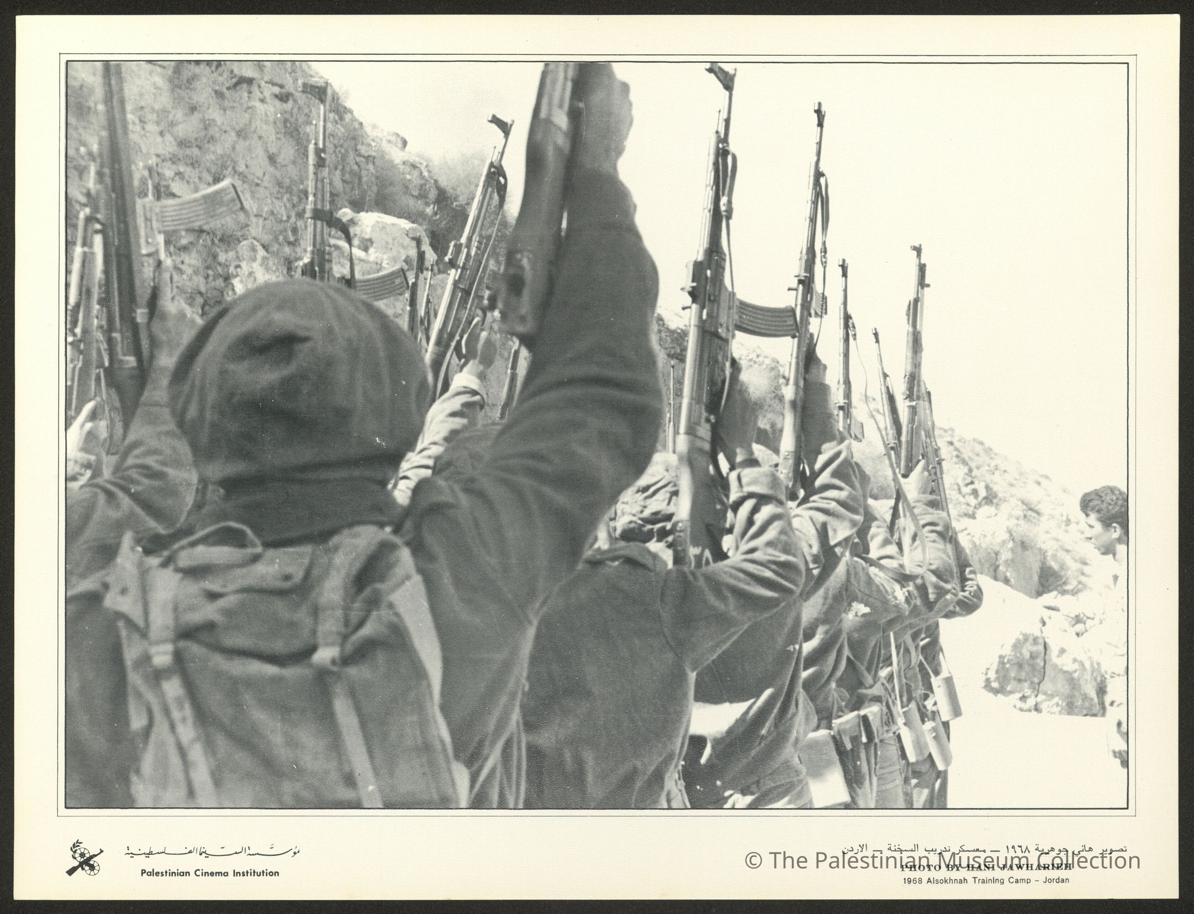 Taken by photographer Hani Jawharieh in 1968, this black-and-white photograph shows a group of men carrying rifles at al-Sukhna Training Camp in Jordan.