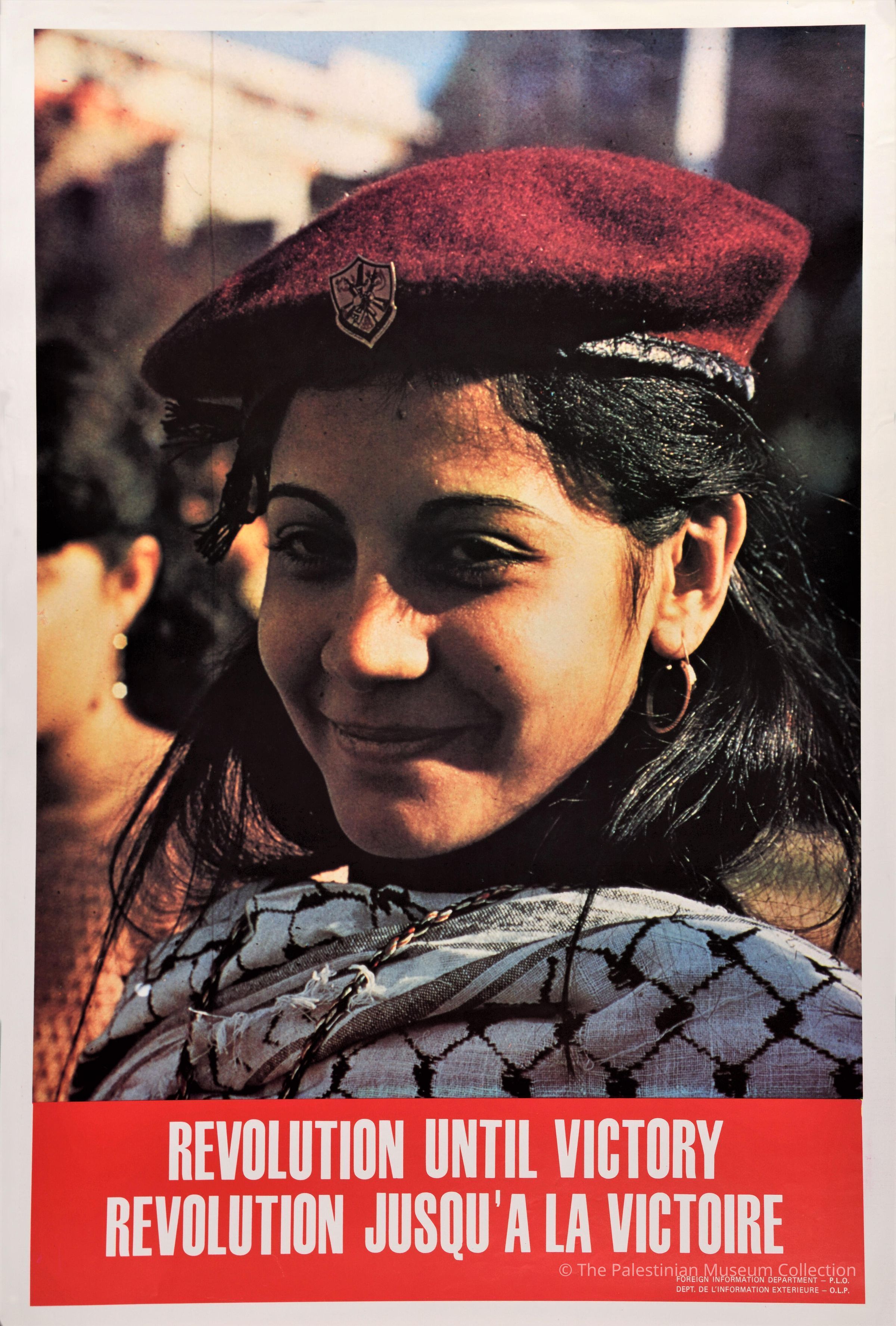 ملصق ملون، تظهر فيه فتاة ترتدي الزي العسكري والكوفية الفلسطينية، وعنون الملصق بـ "ثورة حتى النصر" باللغتين الإنجليزية والفرنسية.