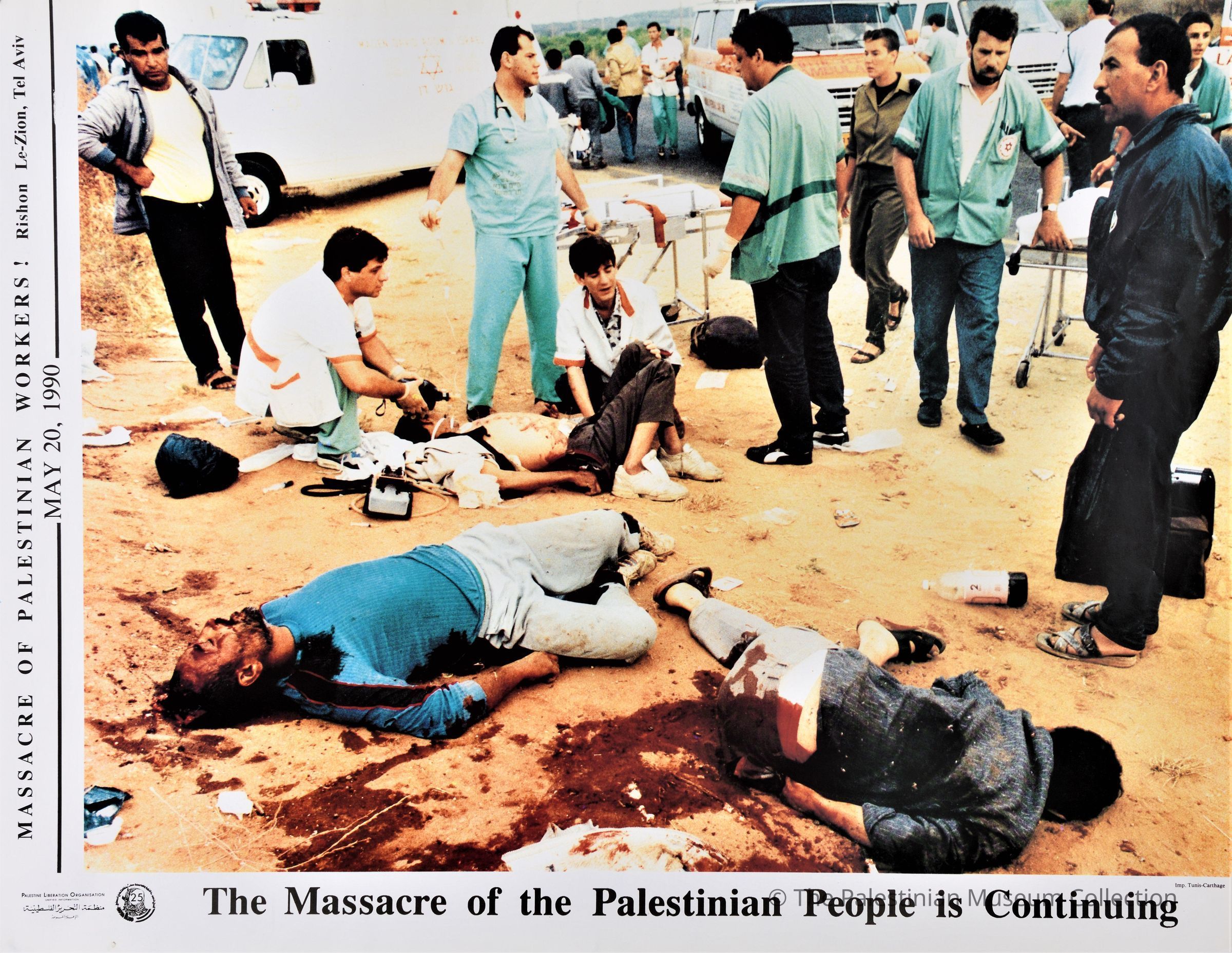 A colour poster showing a group of paramedics treating those wounded during the Ayon Qara Massacre. The Massacre took place when an Israeli Commander "Ami Popper" asked Palestinian workers; who were waiting for their employers, to hand over their IDs. Then, he asked them to stand up against the wall and shot them dead (7 were killed and 10 were wounded), and then he flee the scene.