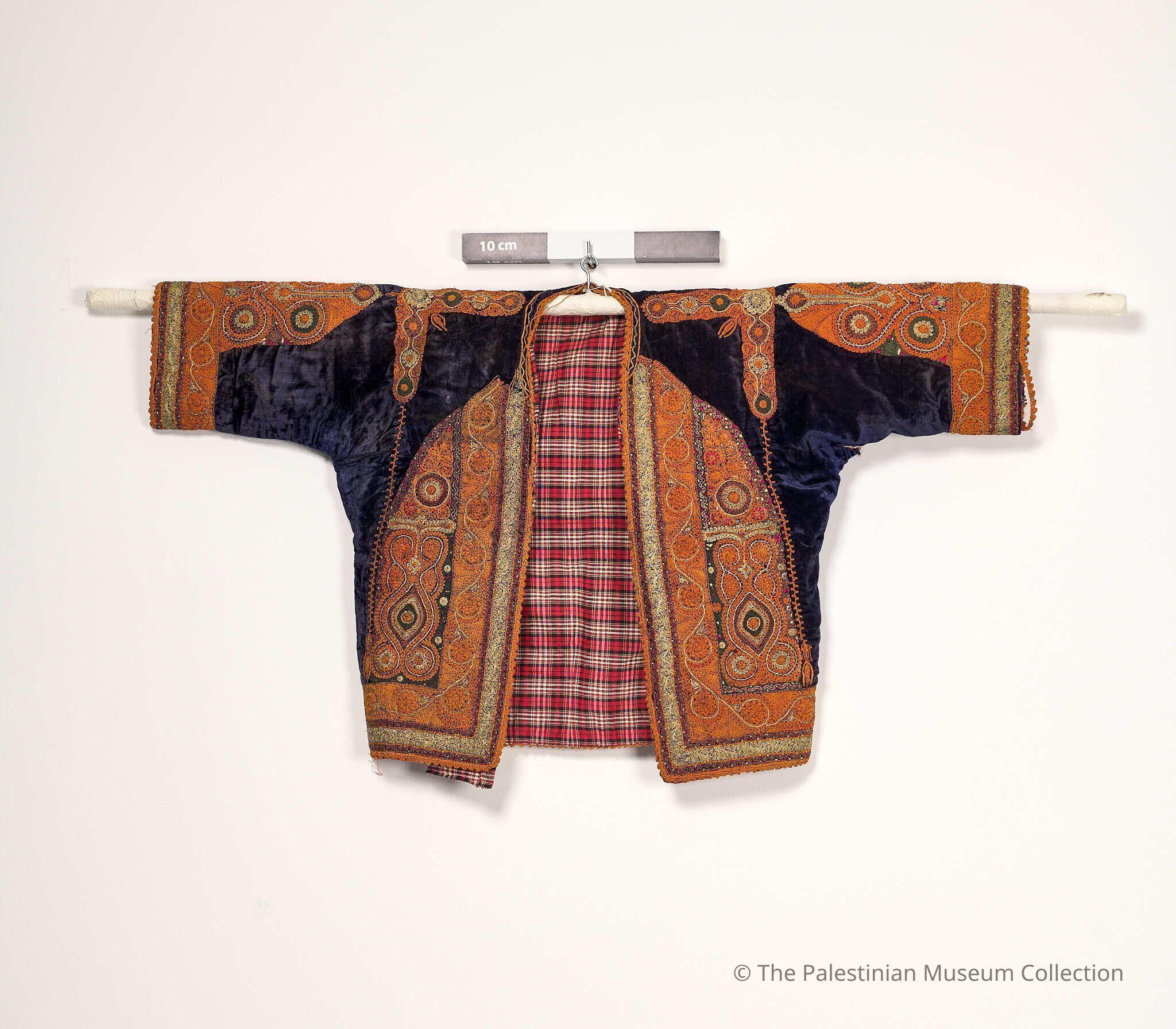 Taksiri (overcoat) from Bethlehem made of navy velvet and embroidered with orange silk threads and gilded qasab (metallic couching cords). The taksiri is distinguished by its short sleeves as women would wear it over a Malak (king) thobe (dress) with its mradan (long triangular) sleeves draping and typically embroidered with shapes matching the taksiri. It has a cotton lining and is embroidered with tahriri (couching) stitch. The cuffs and front panel have dense tatreez (embroidery) with plant shapes, whereas the back panel has light tatreez, and the shoulders have epaulette-like motifs.Made/Created