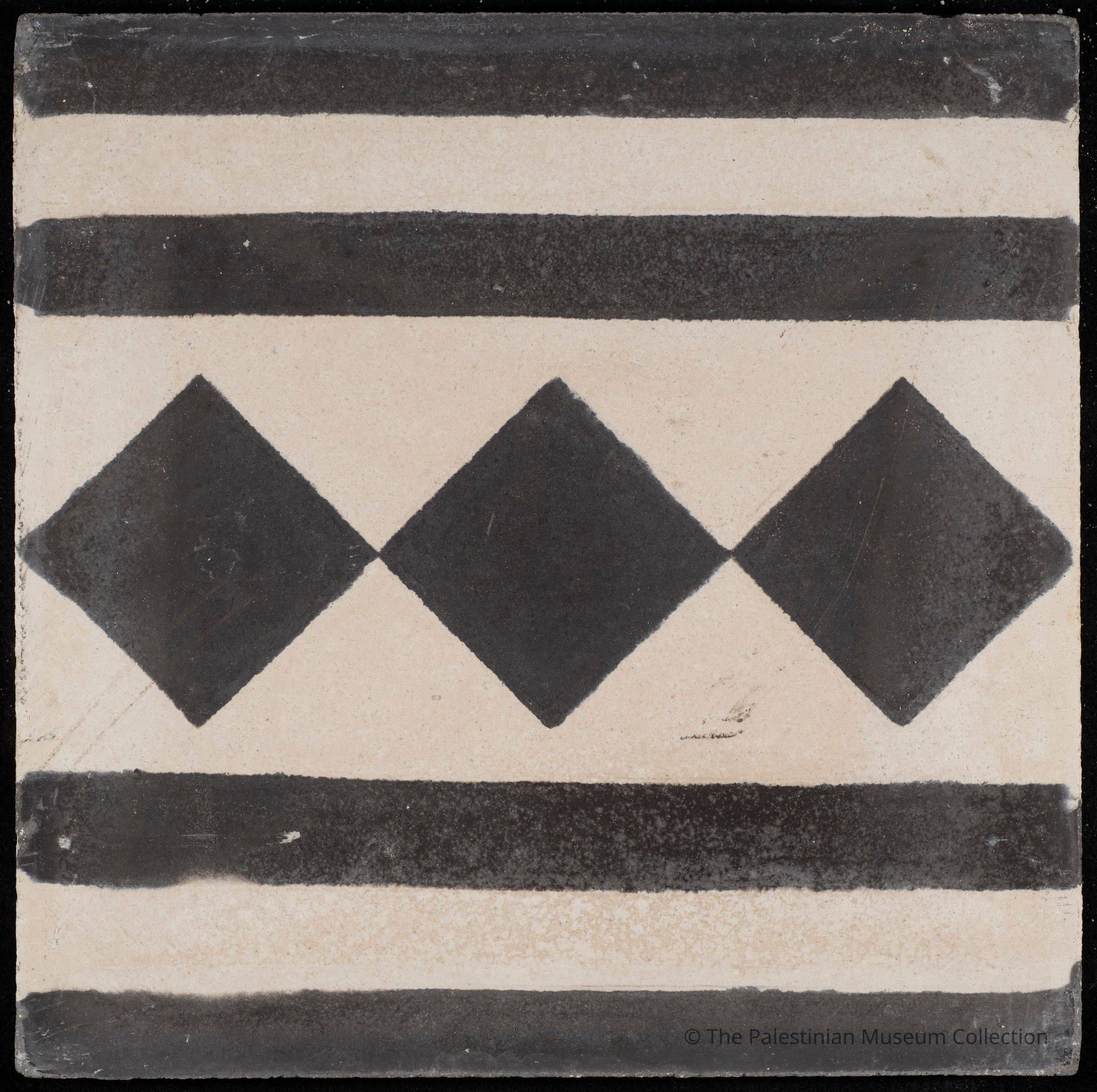 بلاطة إسمنتيّة ملوّنة بحجم 20 × 20 سم، تحمل تصميم "بلاطة زنار المربعات - الشطرنج"، وهي نموذج حديث سُكبت في قالب يمتلكه مصنع أصلان للبلاط في نابلس يعود إلى ثلاثينيات القرن العشرين.