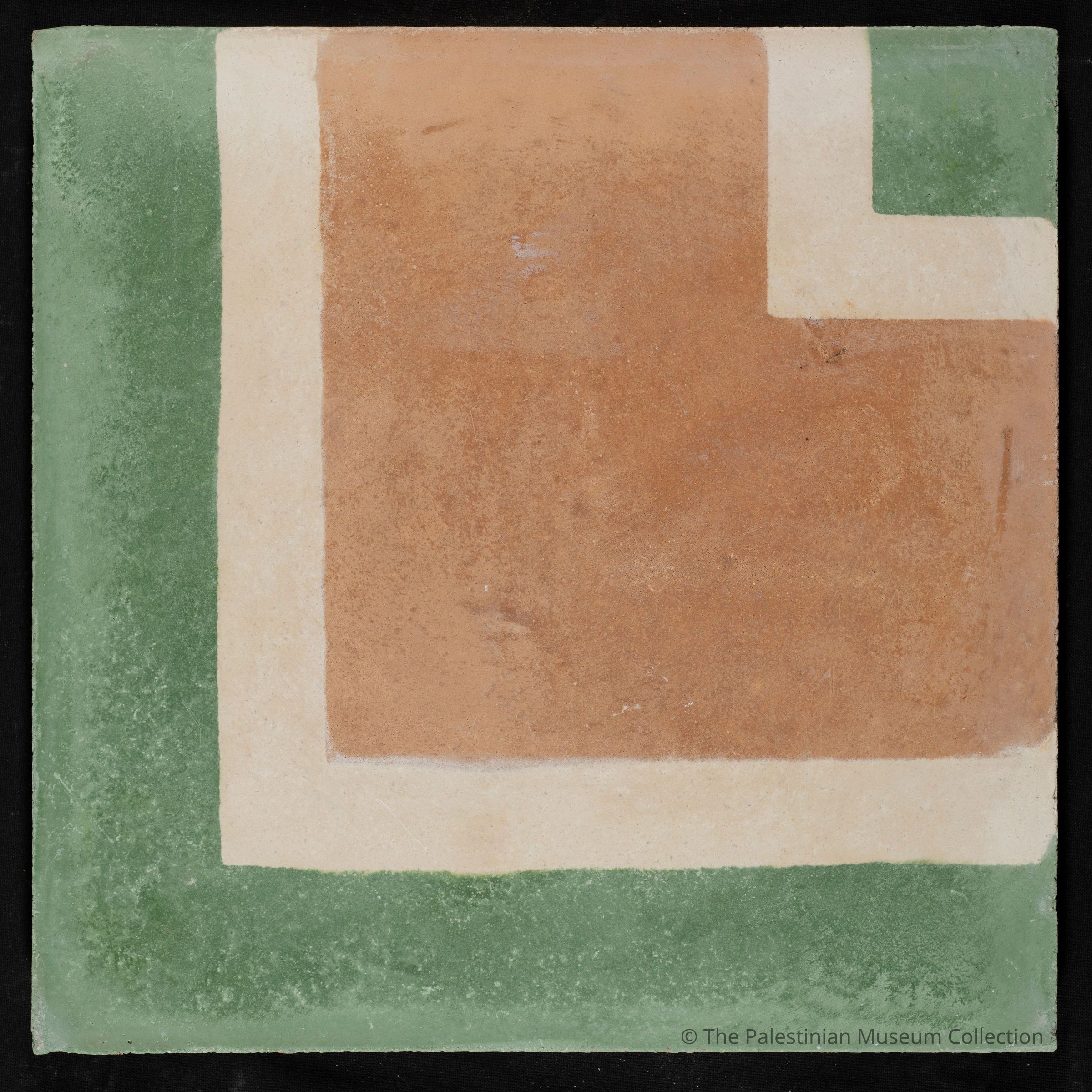 A 20 × 20 cm coloured cement tile featuring the "Corner of Zunnar Al-Huz (Line Border)" design. This tile is a contemporary reproduction, cast using an original mold from the Aslan Tile Factory in Nablus.Made/Created