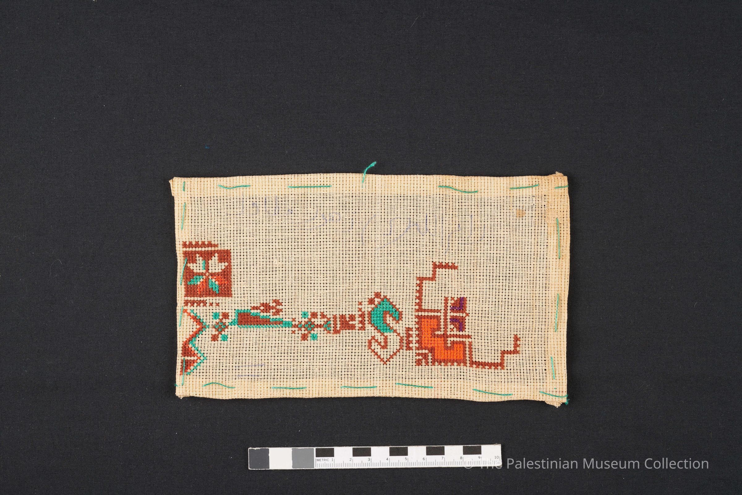 نموذج تطريز على قماش ايتامين بحرير لون ازرق وبرتقالي وبني وبنفسجي برسومات متعددة منها نجمة بيت لحم وخيمة الباشا وجبال وحرف S