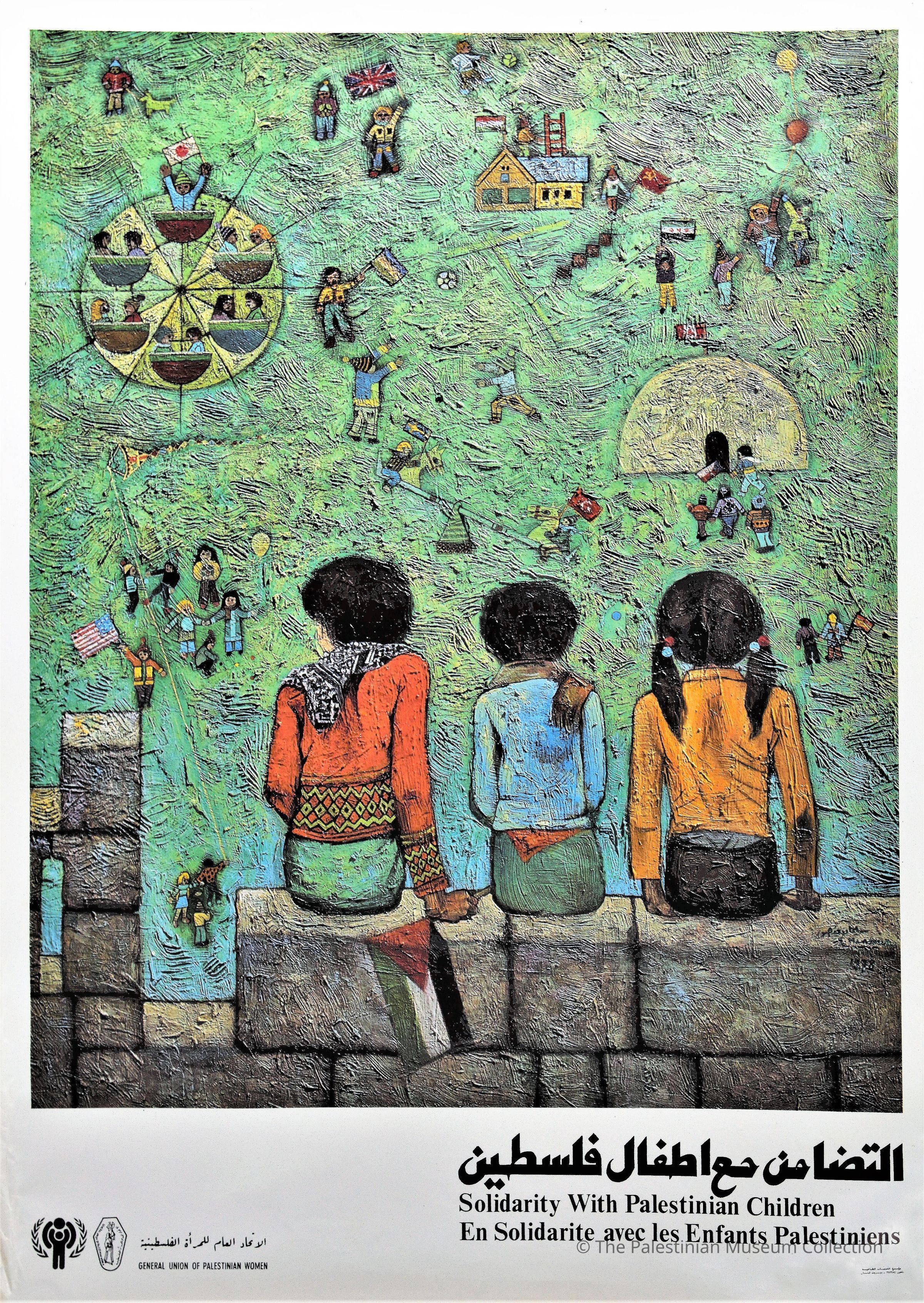 A colour poster showing three children sitting on a wall; one of them holding the Palestinian flag, looking at children playing in the park; each of these children is holding the flag of their country.Dimensions
