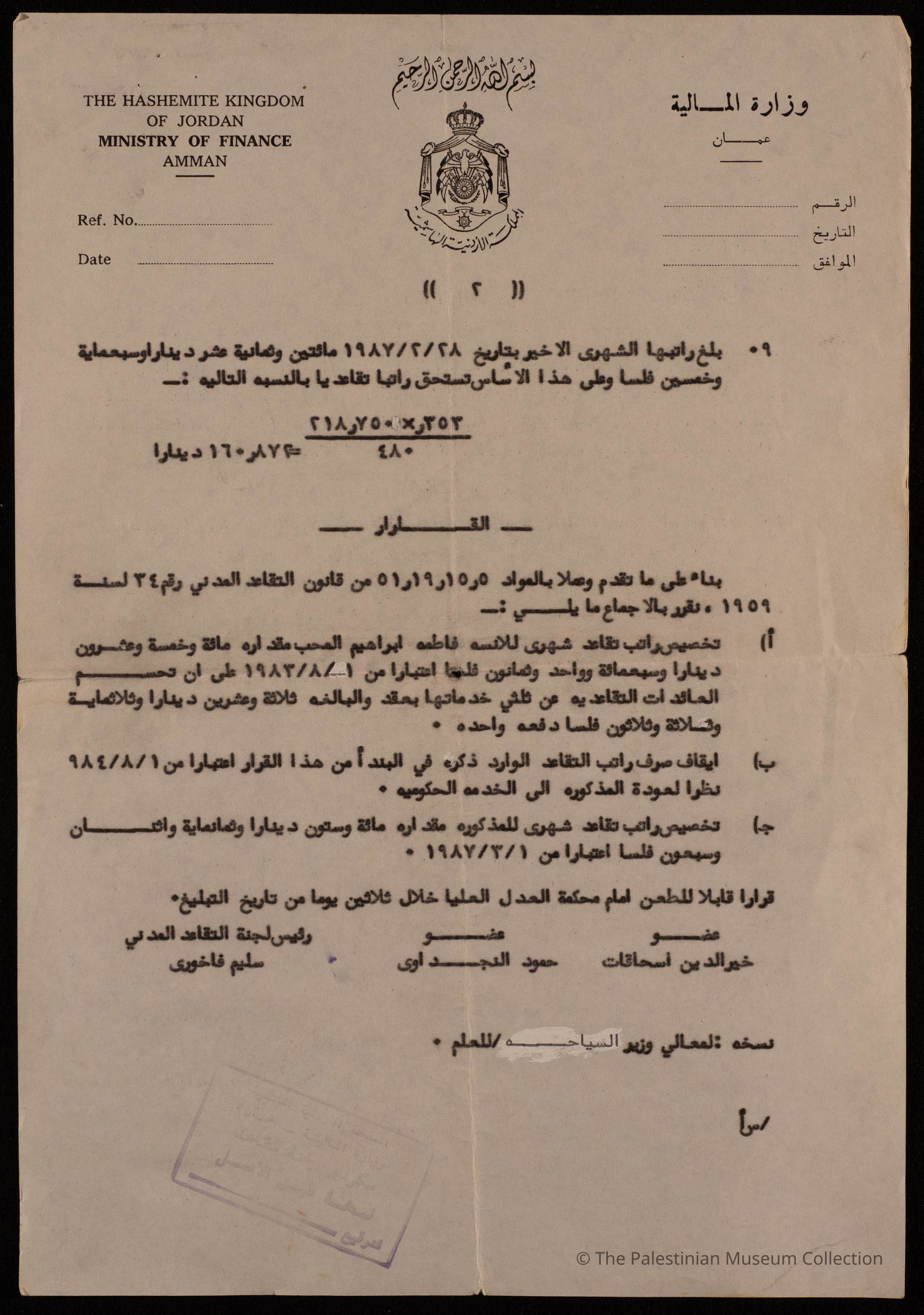 An official document issued by the Ministry of Finance in the Hashemite Kingdom of Jordan regarding the allocation of a monthly retirement pension for Miss Fatima Muhib.