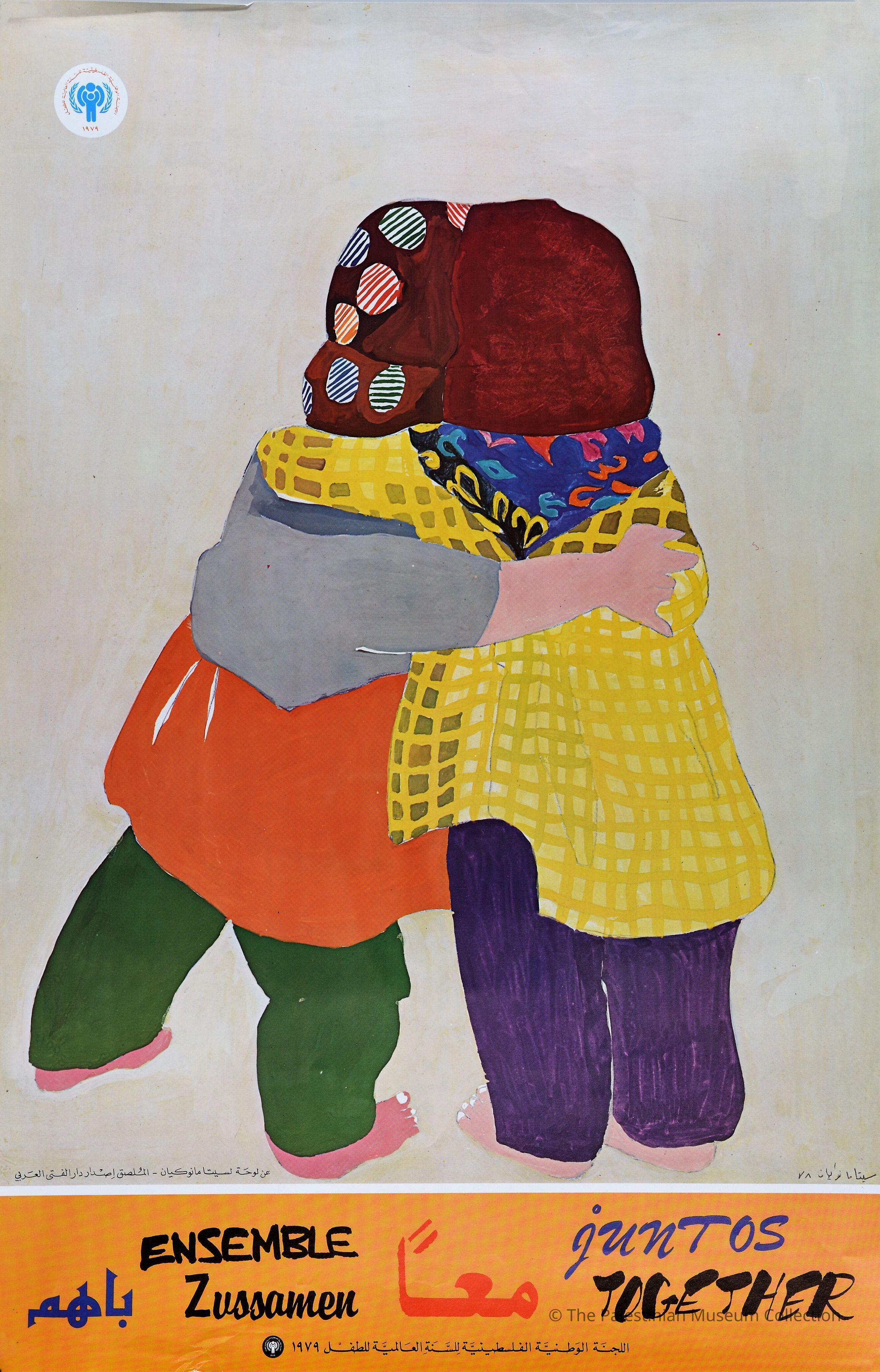 ملصق ملون، عبارة عن رسمة لطفلين يتعانقان. A colour poster showing two children hugging.