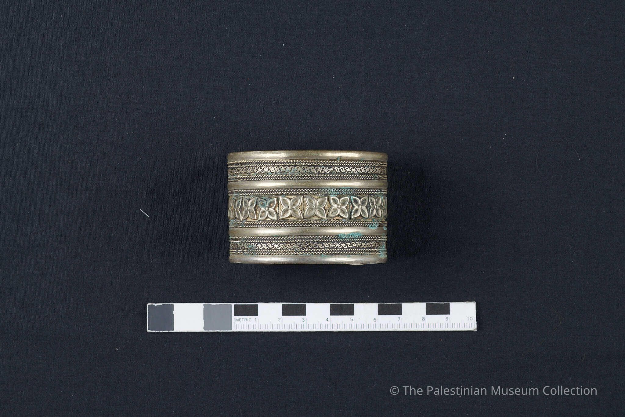 إسورة عريضة من الفضّة، مُزخرفة ومنقوشة في الوسط بصفّ من الورود، وهي بلا قفل، ومفتوحة من الخلف، وفي نهايتَيها ما يشبه الأسنان.