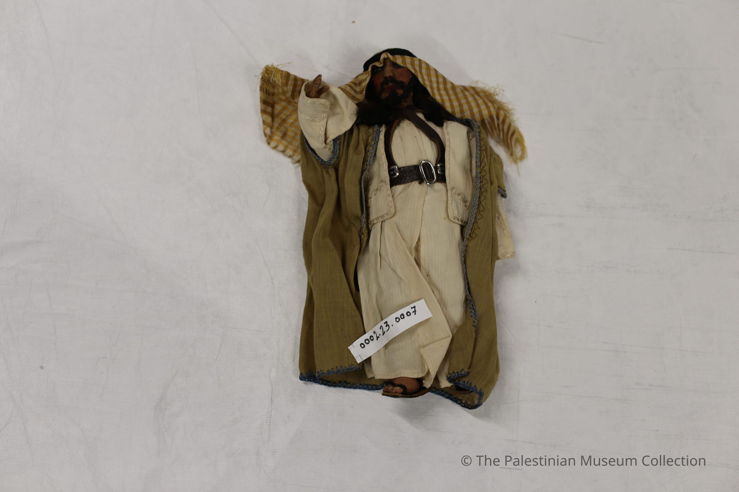 دمية رجل بدوي مصنوعة من القطن والكتان، له لحية وشعر طويل خشن لونه اسود، يرتدي ملابس تراثية وهي