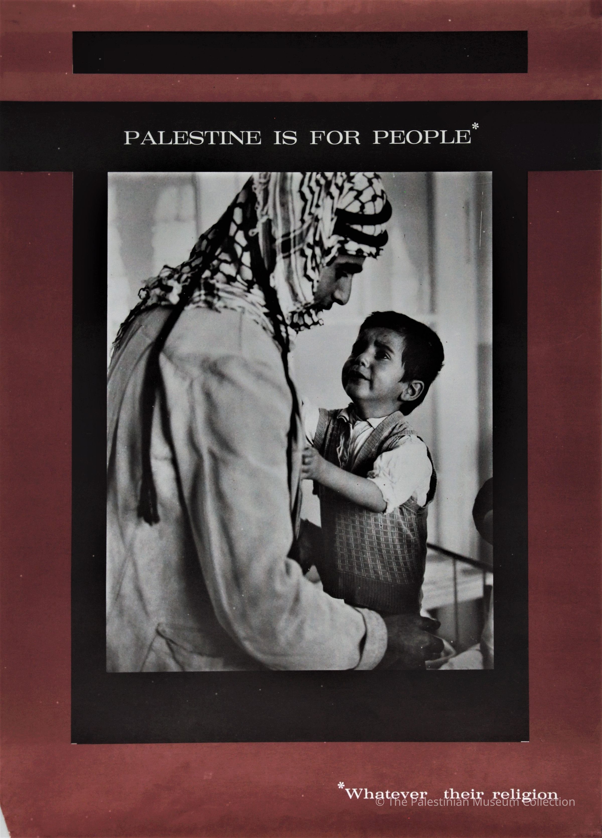 A colour poster showing a man in a Kufiya and a sad child holding the his hand.Dimensions