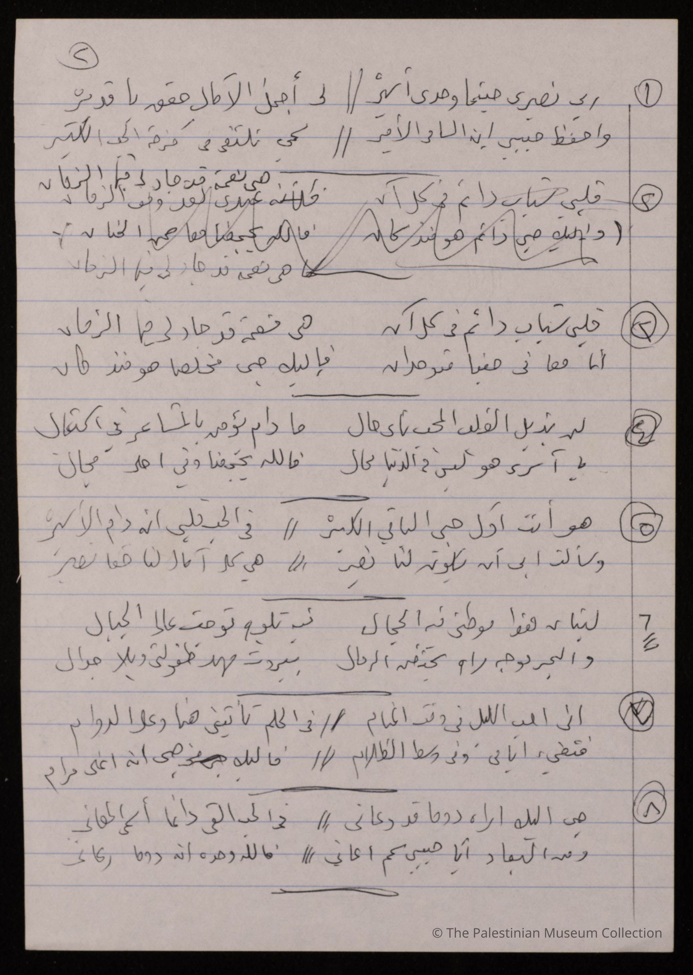 مخطوطة قصيدة باللغة العربية بلا عنوان للشاعرة فاطمة المحب، ولا تحمل الوثيقة اية اشارة الى تاريخ كتابتها.