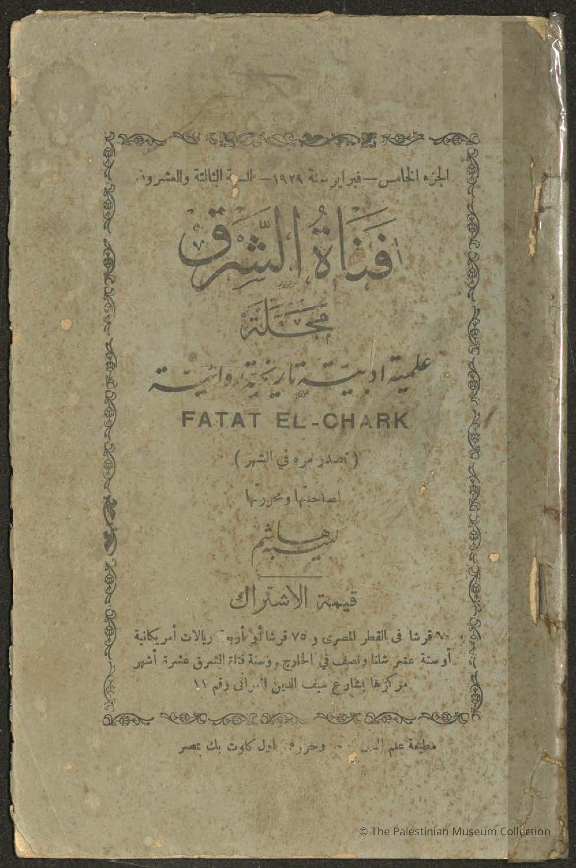 The fifth issue of the twenty-third year of Fatat Al-Sharq magazineو a monthly scientific, literary, historical, and narrative periodical that was published in Egypt. It was issued in February 1929 by the Alamuddin Press. The magazine was approved by the Ministry of Education and the provincial councils for girls' schools, and this issue consists of 56 pages.Dimensions