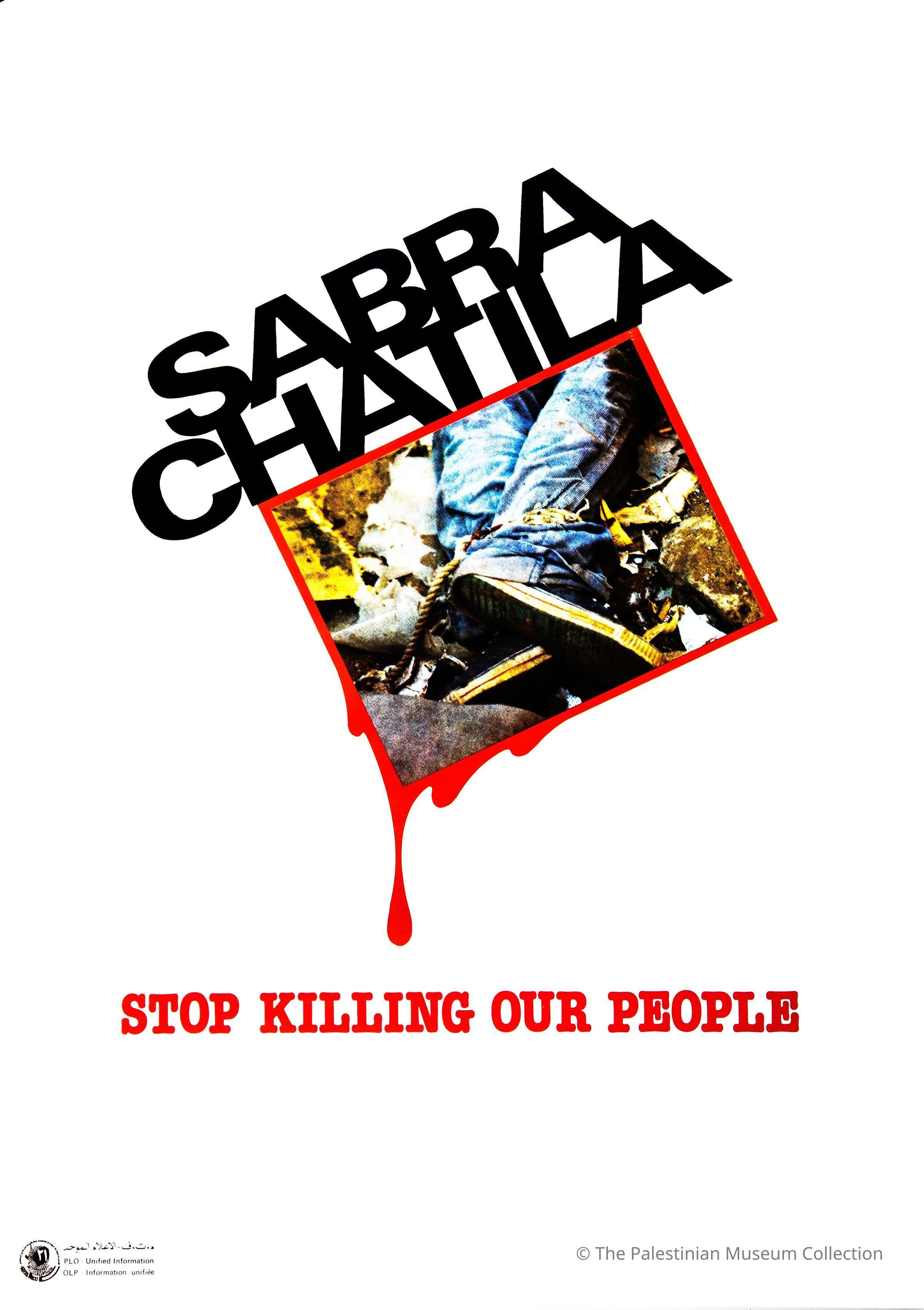 A poster entitled 'Sabra Chatila, Stop Killing Our People' issued by the Unified Information Office of the Palestine Liberation Organisation (PLO) in 1986.Dimensions