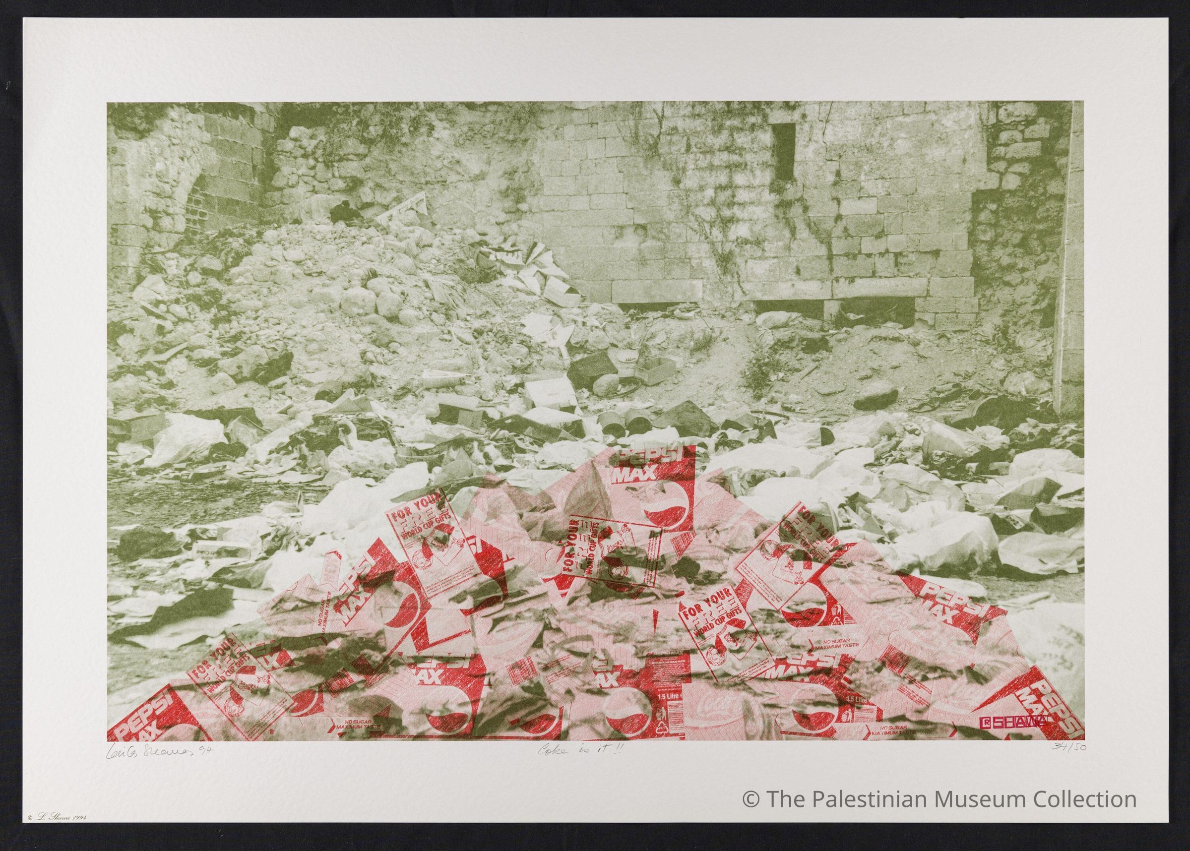 ليلى الشوّا، هي الكوكا كولا؟، من سلسلة جدران غزّة، 1994. طباعة على ورق، 50 x 38 سم.