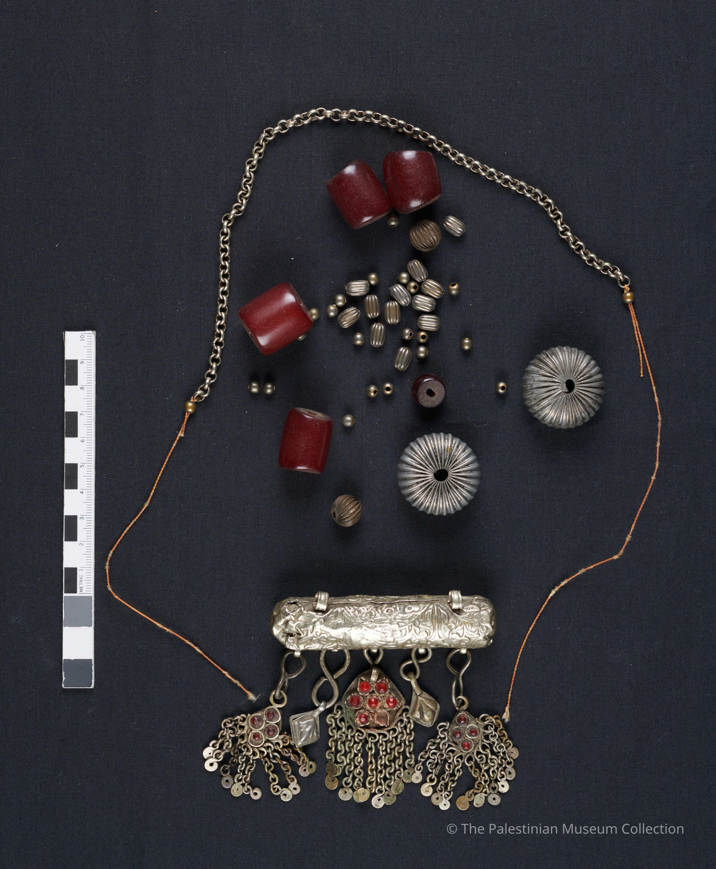 Necklace consisting of a thick chain decorated with red amber beads and silver spheres. It carries an engraved cylindrical silver handcrafted hijab, also known as a khiyara, or an amulet within which would be placed a piece of paper inscribed with prayers or Quranic verses, whose invocation was believed capable of driving evil away or exorcising evil spirits from a possessed personMade/Created