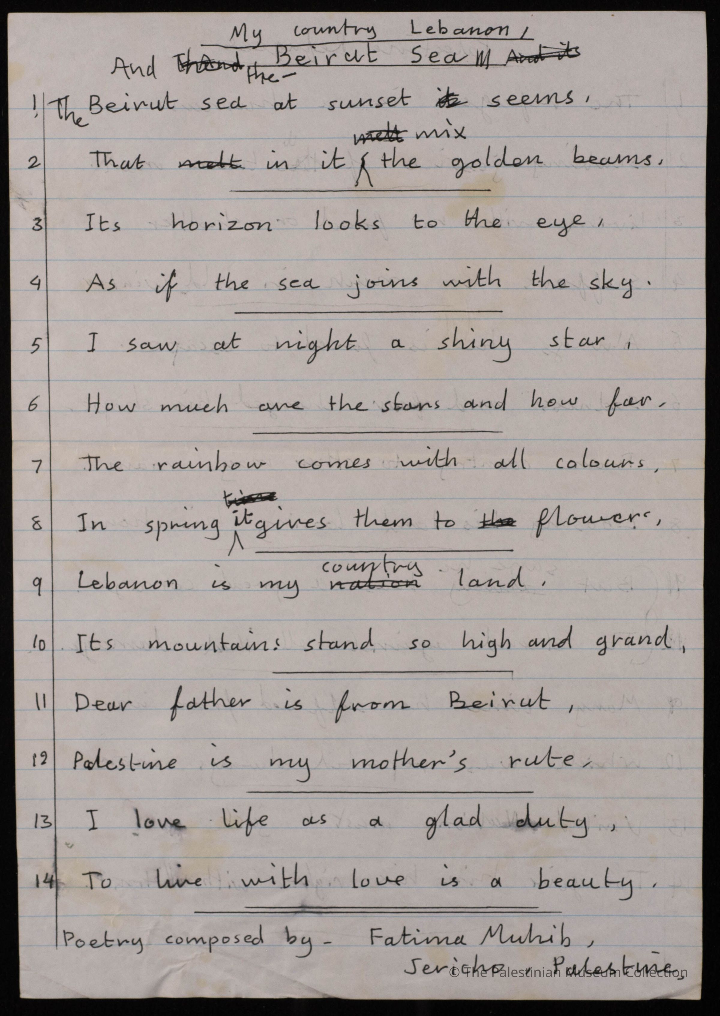 مخطوطة قصيدة باللغة الانجليزية بعنوان " بلدي لبنان وبحر بيروت