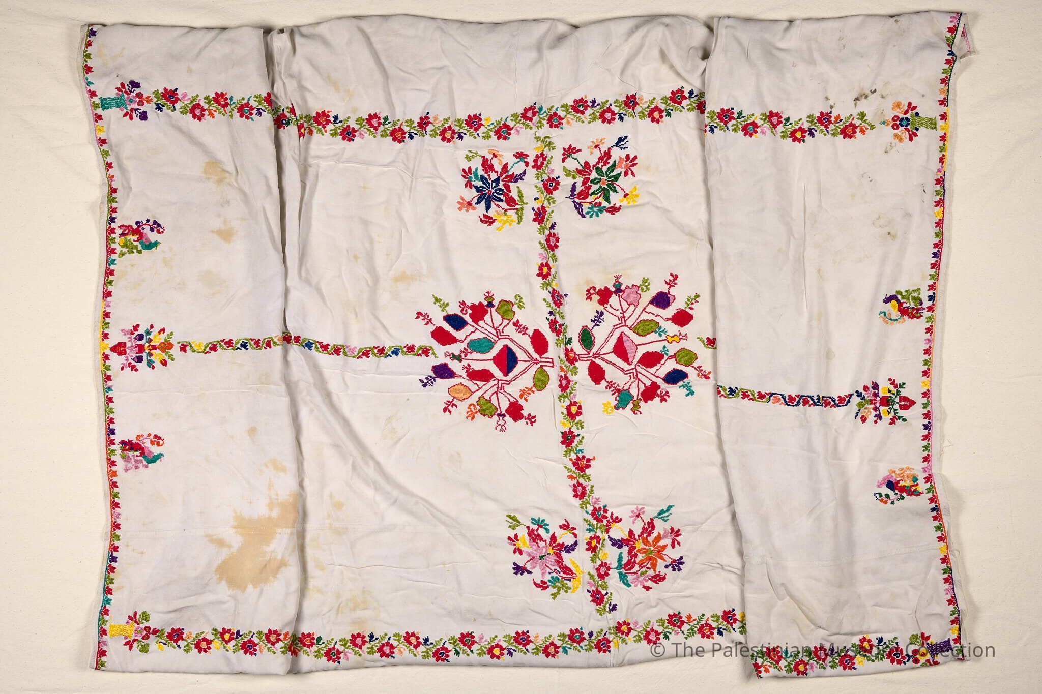Ghudfah Shawl, a rectangular shawl from Hebron city which would be worn on the head. It is made of white cotton and embroidered with silk and cotton threads in plant and geometric shapes along with rose pot and rose motifs.Made/Created