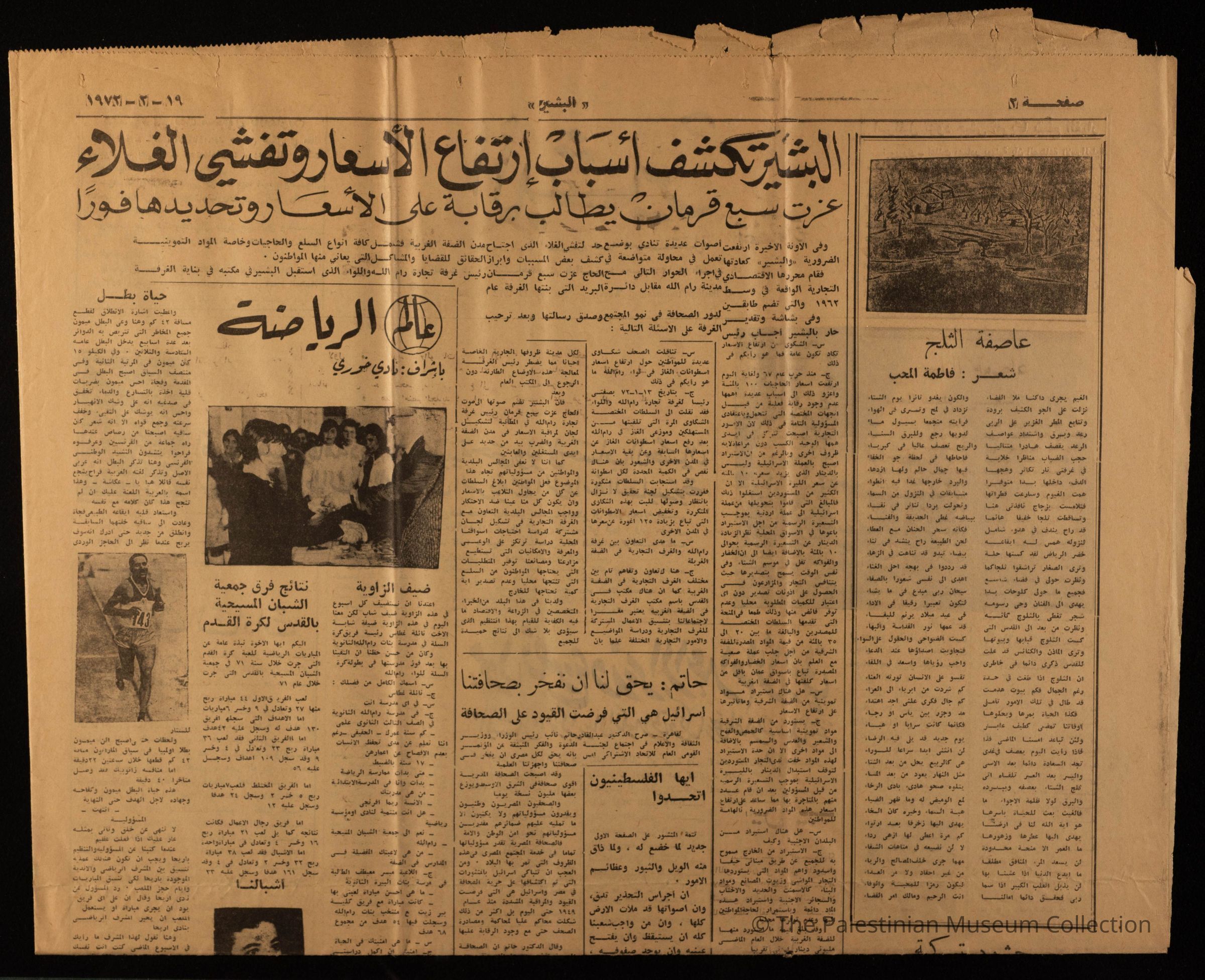 شعر بعنوان "عاصفة الثلج" بقلم فاطمة المحب في الصفحة الثانية من العدد 59 من جريدة البشير، وقد صدر هذا العدد بتاريخ 19 شباط 1972.