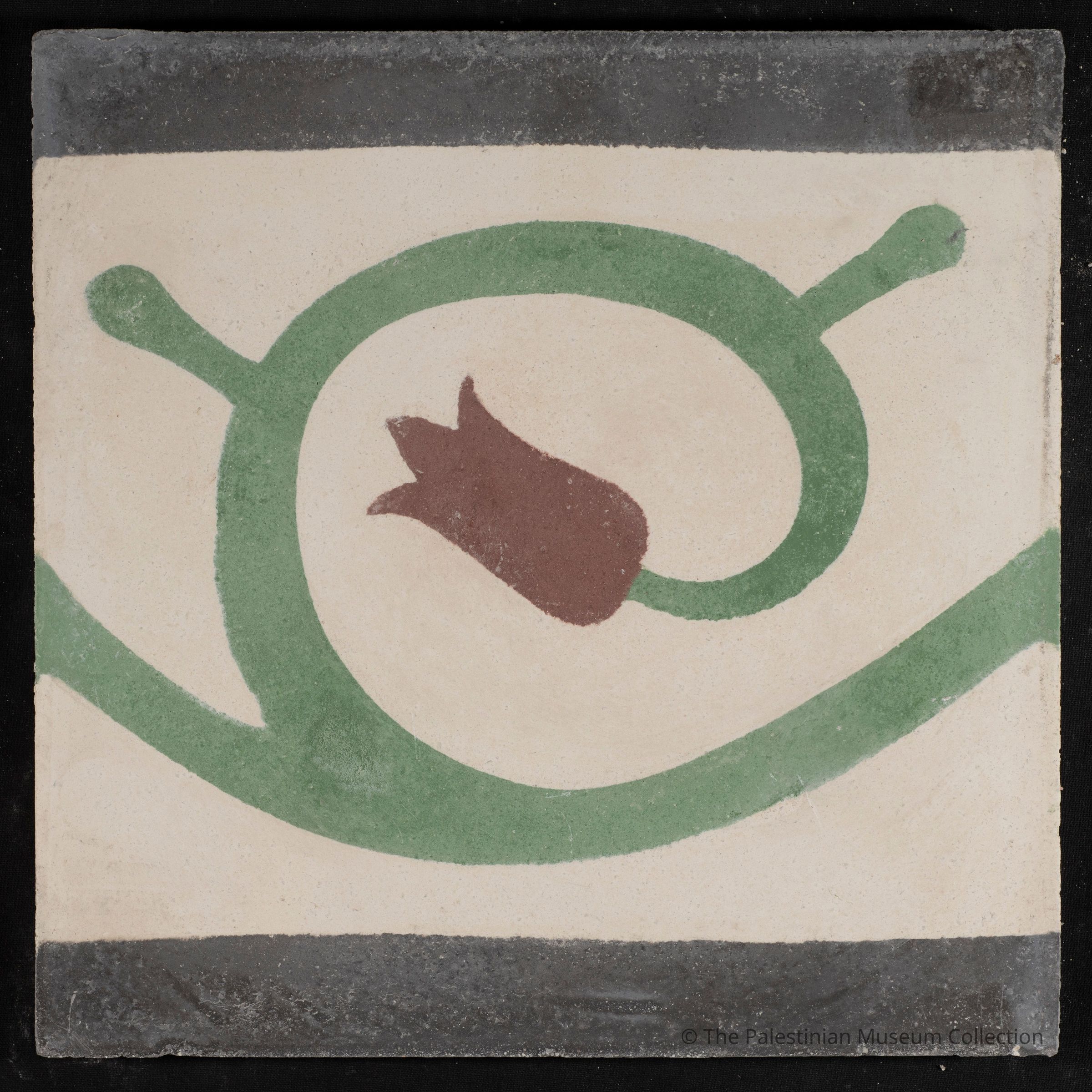 A 20 × 20 cm coloured cement tile featuring the "Cup Border (Zunnar)" design. This tile is a contemporary reproduction, cast using an original mold from the Aslan Tile Factory in Nablus, which dates back to the 1940s.Made/Created