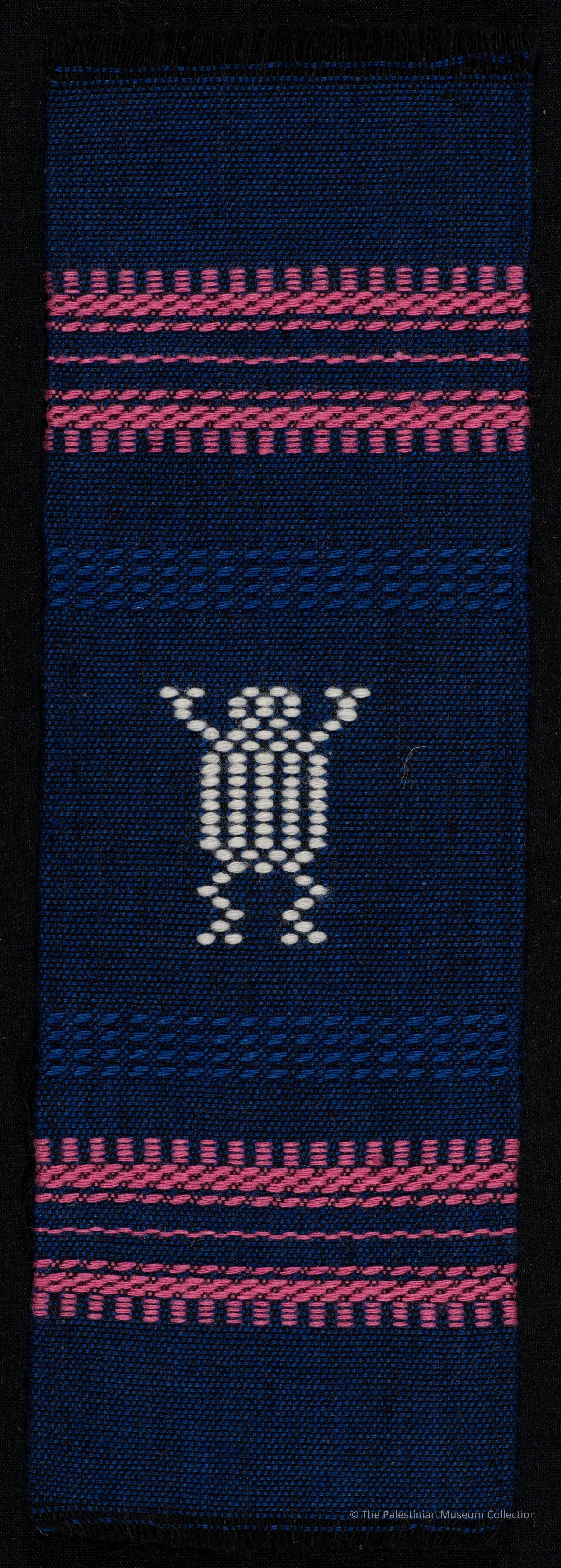 منديل سفرة من قماش الكتان باللون الكحلي، مربع الشكل، ومُطرّز بقطبة الصليب الفلاحية بخيوط حرير باللون الزهري والأزرق والأبيض بخطوط أُفقية وشكل ولد.