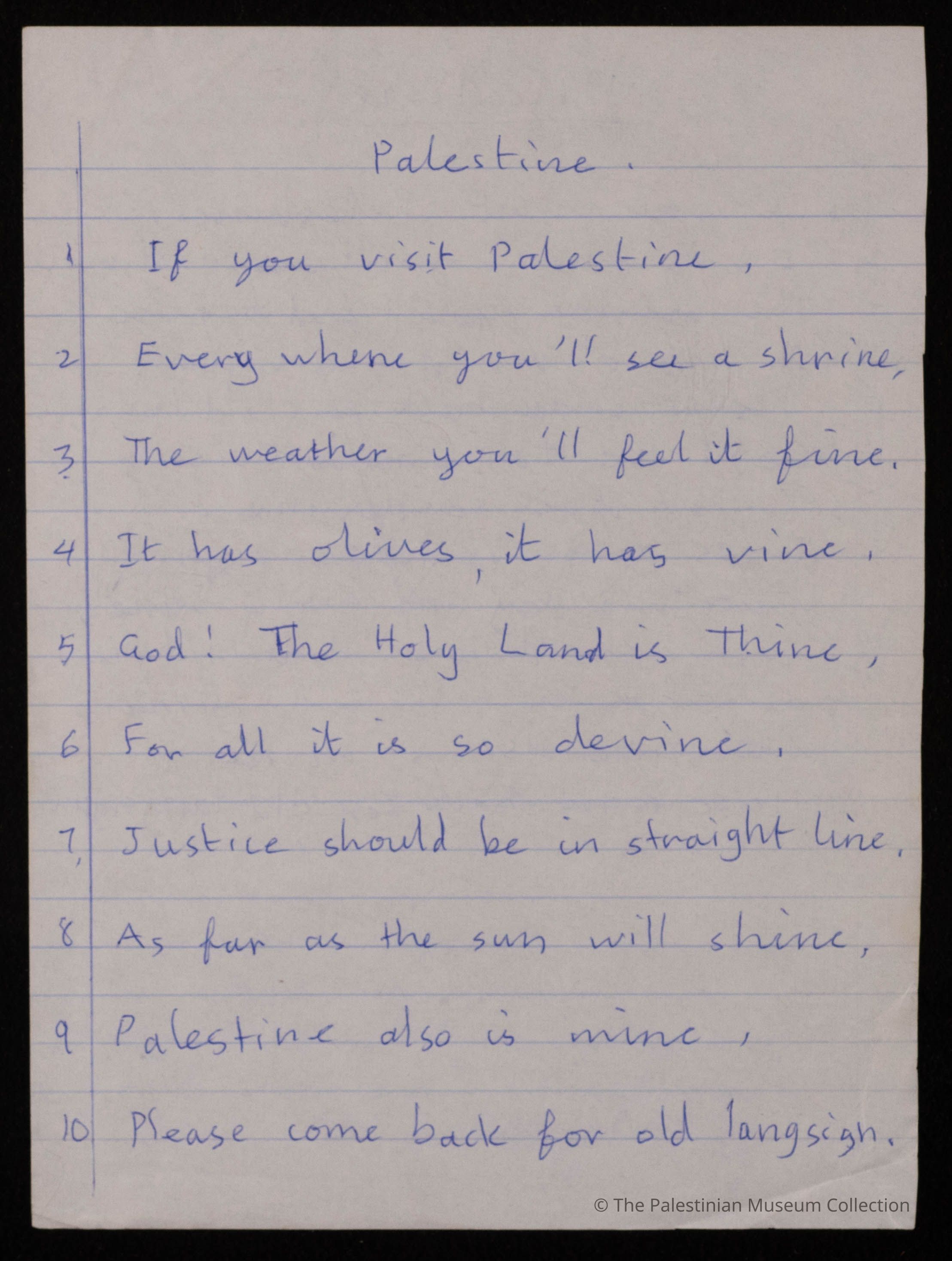 مخطوطة قصيدة باللغة الانجليزية بعنوان "Palestine" للشاعرة فاطمة المحب، ولا تحمل الوثيقة اية اشارة الى تاريخ كتابتها.
