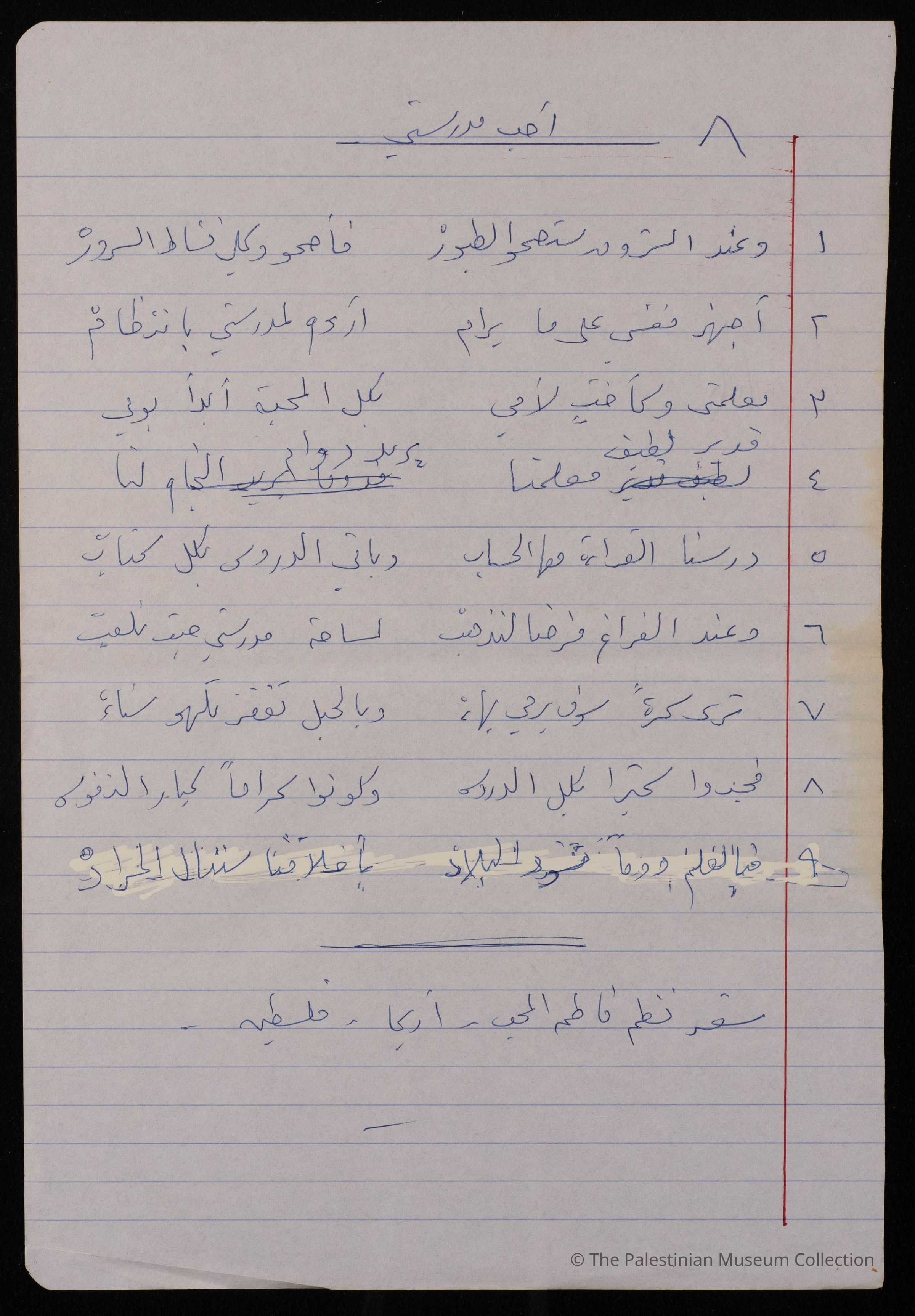 مخطوطة قصيدة باللغة العربية بعنوان " احب مدرستي" للشاعرة فاطمة المحب، نظمت في اريحا- فلسطين ، ولا تحمل الوثيقة اية اشارة الى تاريخ كتابتها.