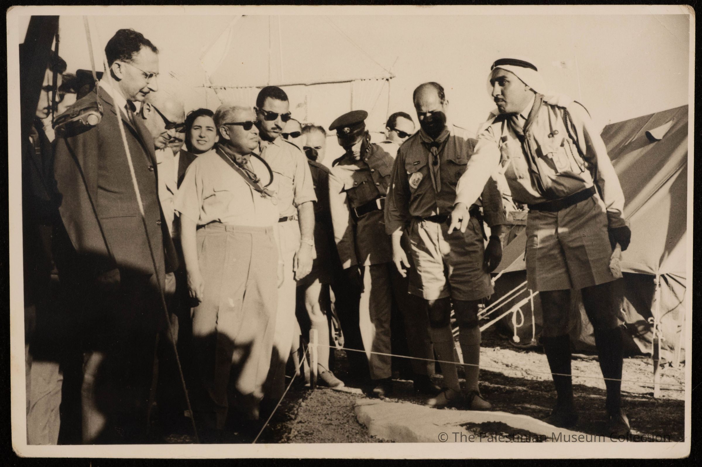 صورة الفنانة فاطمة المحب برفقة شخصيات من الدولة الأردنية في زيارة للمخيمات التي كانوا يعقدونها في أريحا بالشتاء وفي القدس بالصيف، حيث كانت فاطمة المحب مشرفة القسم الفني في تلك المخيمات.