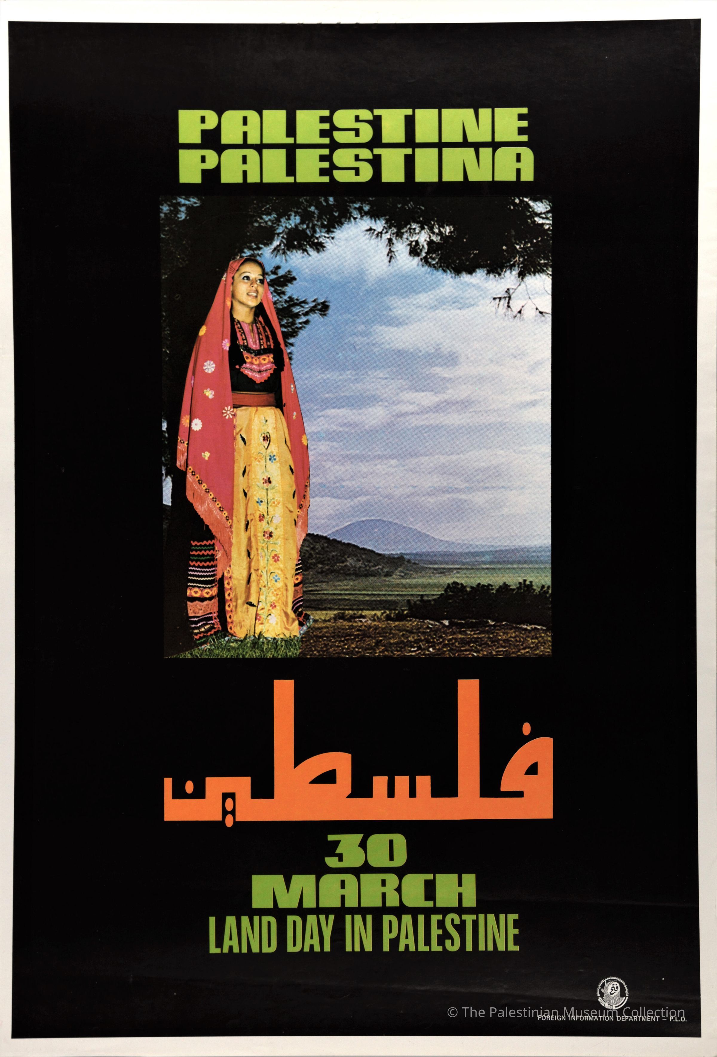 مُلصق بعنوان "فلسطين"، صادر عن دائرة الإعلام الخارجي لمنظّمة التحرير الفلسطينيّة عام 1977 في ذكرى يوم الأرض، الموافق 30 آذار