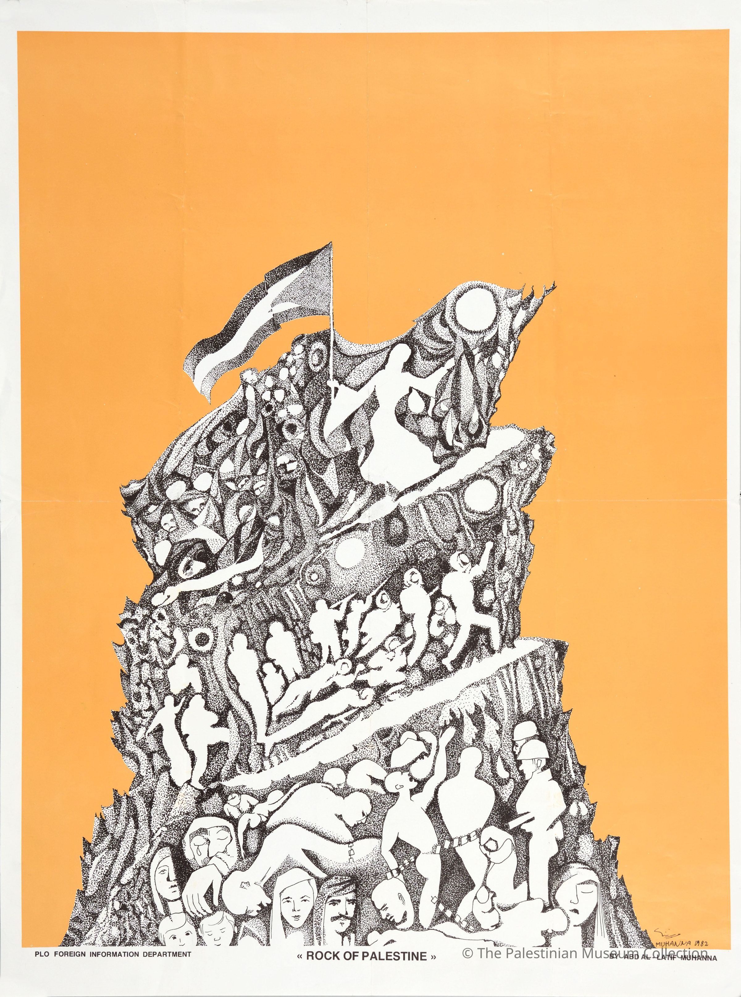 This poster entitled 'Rock of Palestine' was issued in 1982 by the Foreign Information Department of the Palestine Liberation Organisation (PLO). It was designed by the artist Abd al-Latif Muhanna.Dimensions