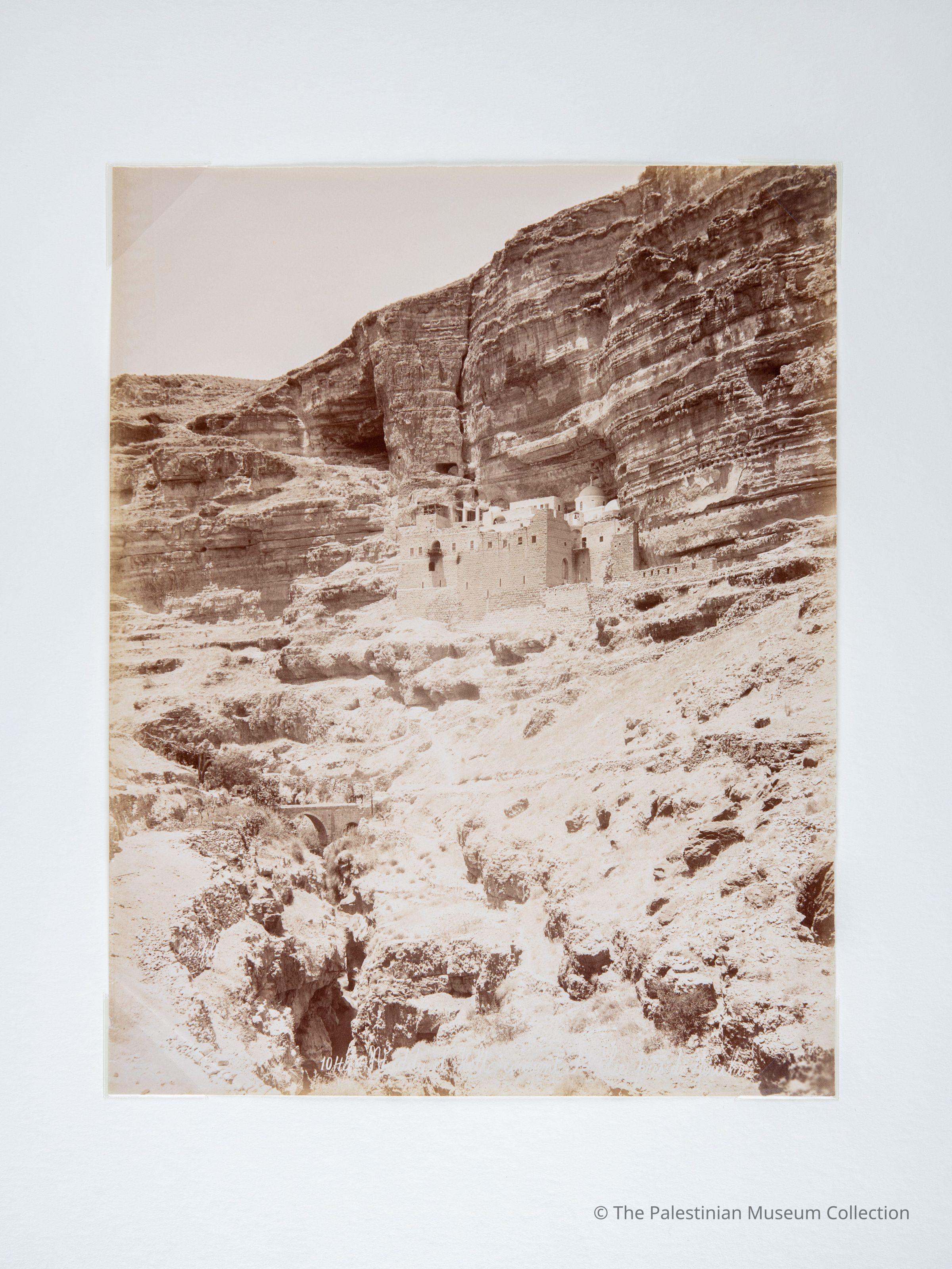 A black-and-white photograph taken by the photographer Felix Bonfils in the second half of the nineteenth century, showing a general view of Wadi al-Qelt in Bethlehem, including the Monastery of St. George, also knows as "Wadi al-Qelt Monastery."Made/Created