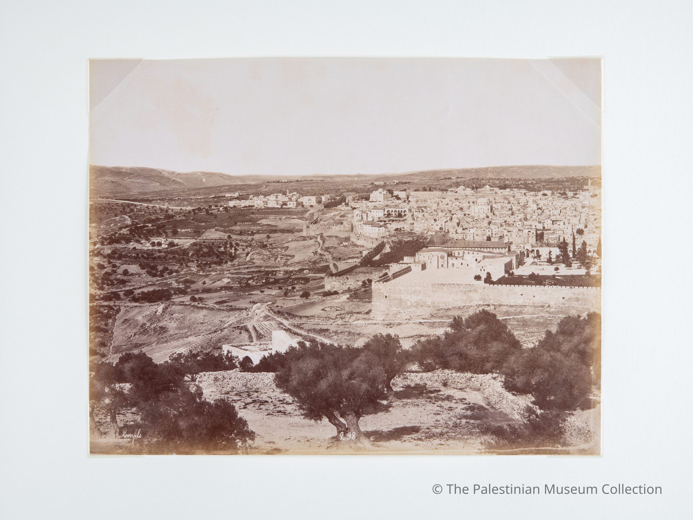 صورة فوتوغرافيّة بالأبيض والأسود، التقطها المصور فيليكس بونفيس في النصف الثاني من القرن التاسع عشر، تُظهر منظراً عاماً لمدينة القدس التقطت من جبل الزيتون، بما يشمل جزءاً من أسوار المدينة، وأشجار الزيتون، والبيوت الحجرية.