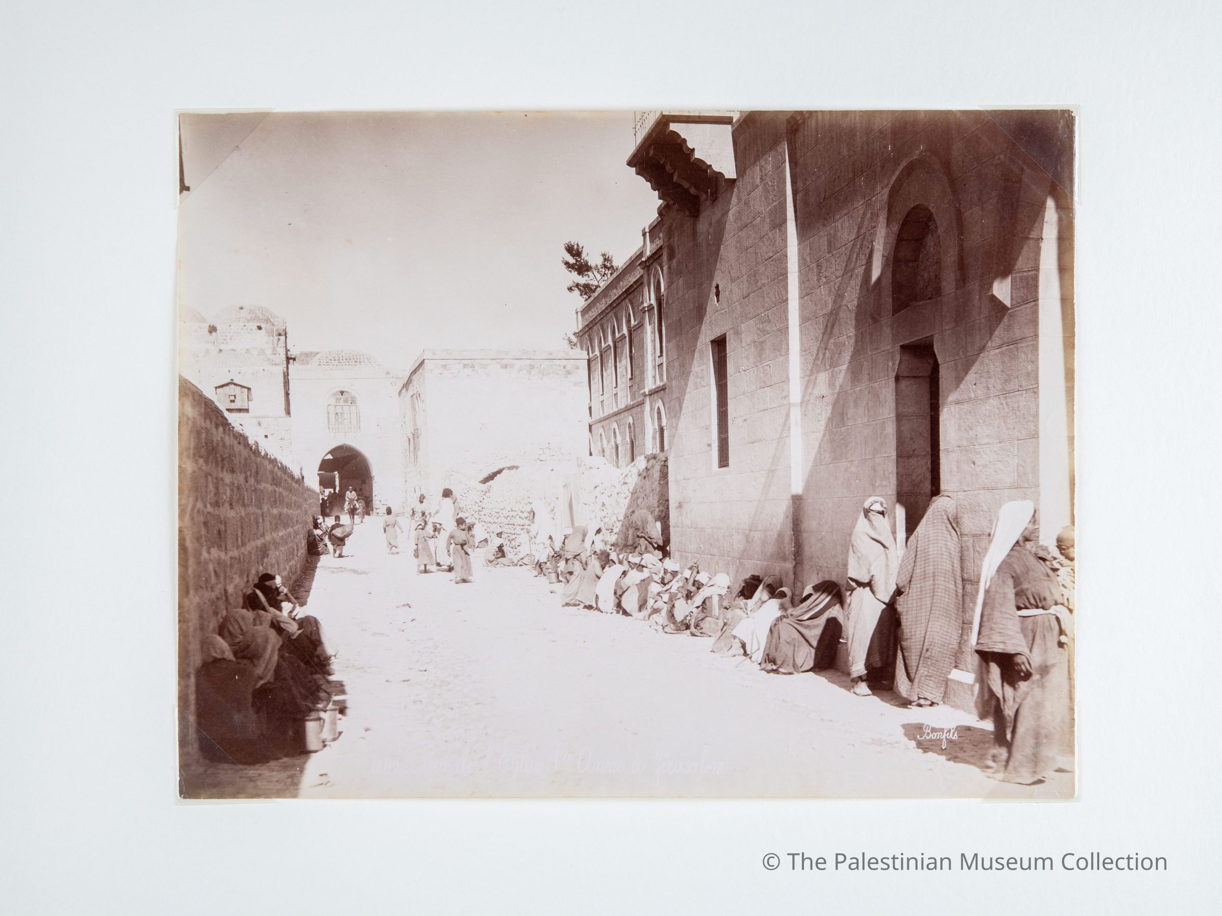 A black-and-white photograph taken by the photographer Felix Bonfils in the second half of the nineteenth century, showing a view of the street of the Church of St. Anne, near the start of the Via Dolorosa, in the Old City of Jerusalem. The photo also shows many mendicants sitting on the sides of the street.Made/Created
