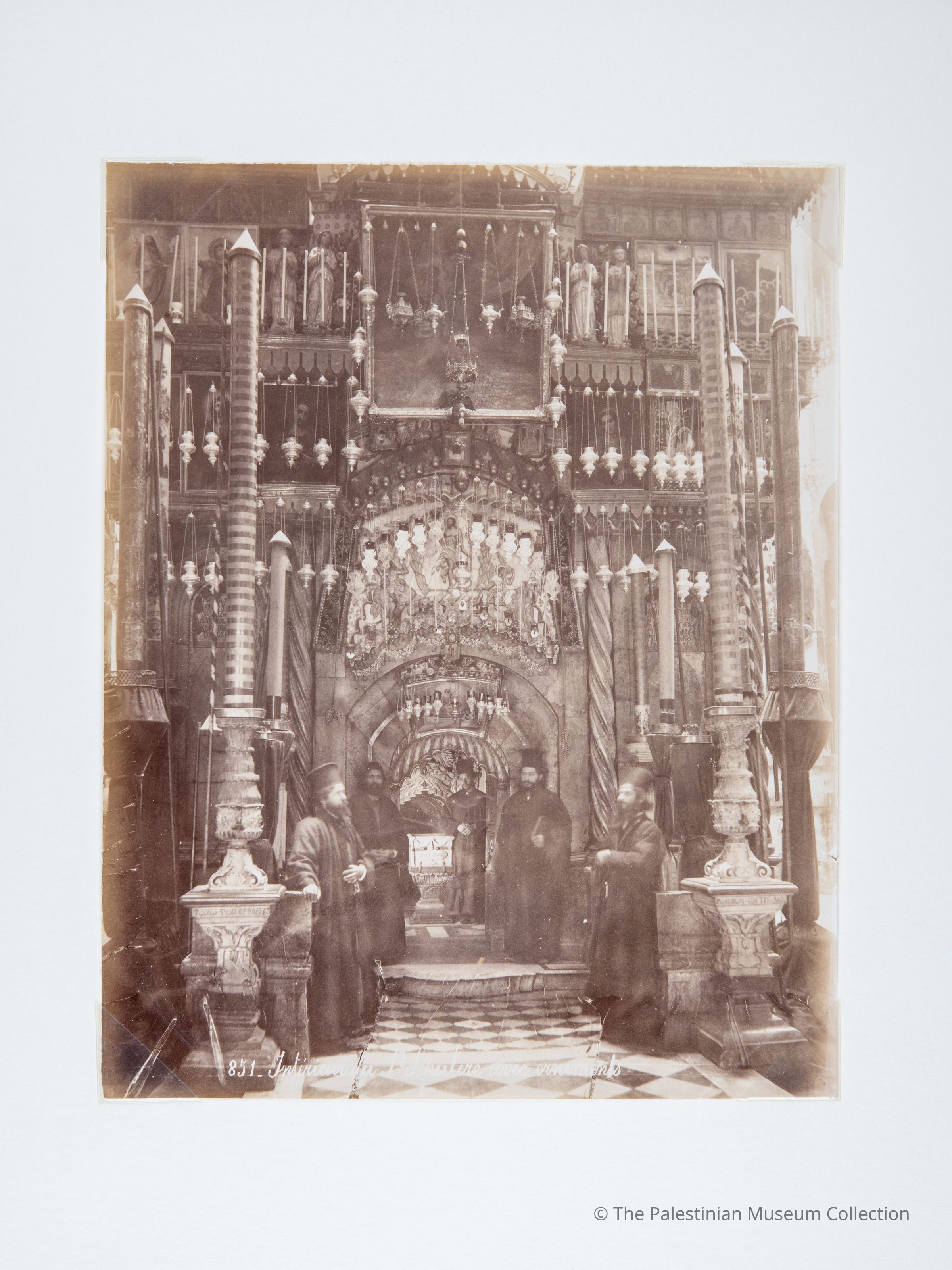 صورة فوتوغرافيّة بالأبيض والأسود، التقطها المصور فيليكس بونفيس في النصف الثاني من القرن التاسع عشر، تُظهر مشهداً داخلياً من كنيسة القيامة، بما يشمل مدخل القبر المقدس ومجموعة من الرهبان وسط الزخارف، والقناديل الزيتية، والشمعدانات الضخمة.