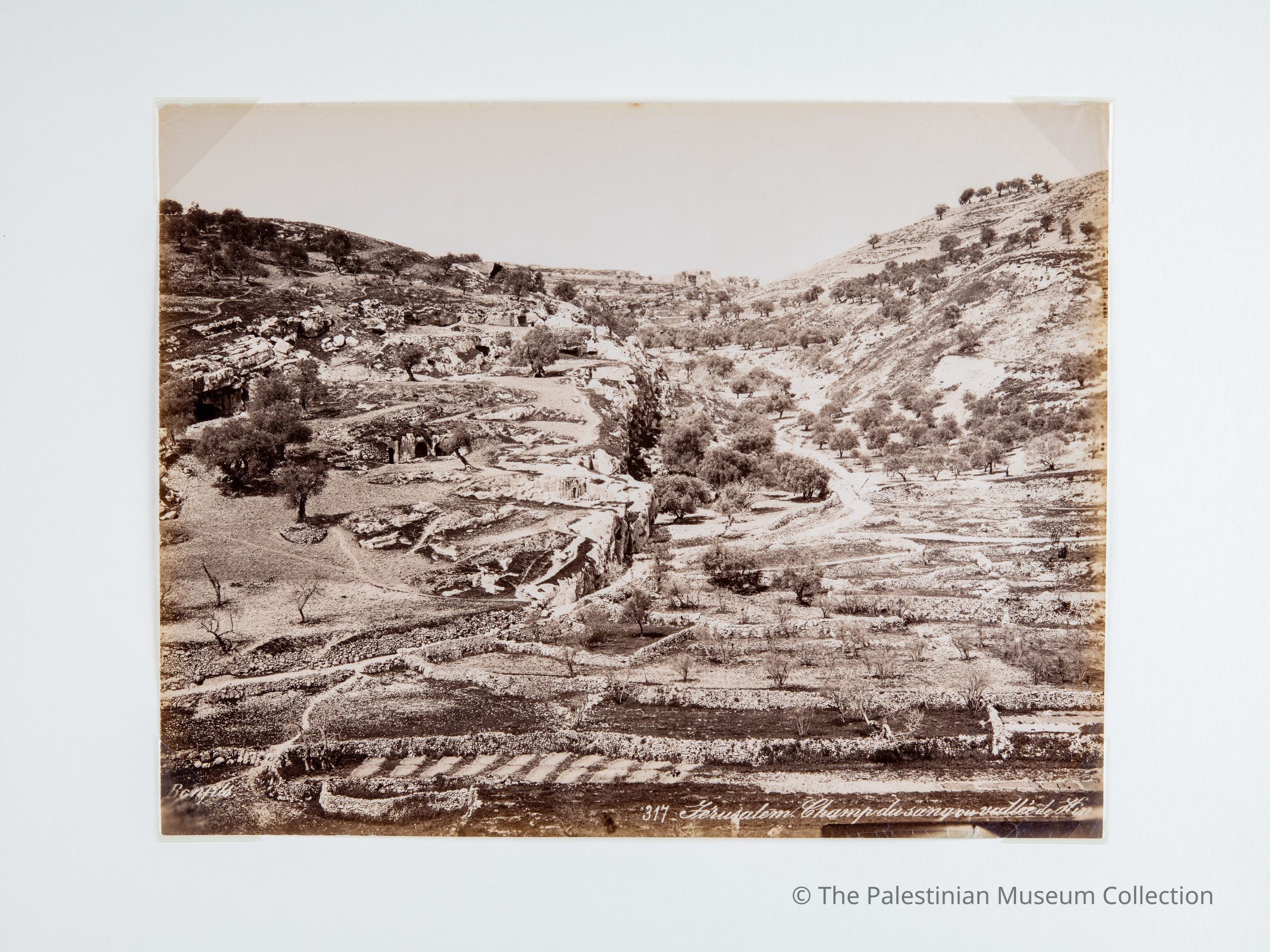A black-and-white photograph taken by the photographer Felix Bonfils in the second half of the nineteenth century, showing a general view of Hannom Valley in the village of Silwan in Jerusalem, including mountains and trees.Made/Created