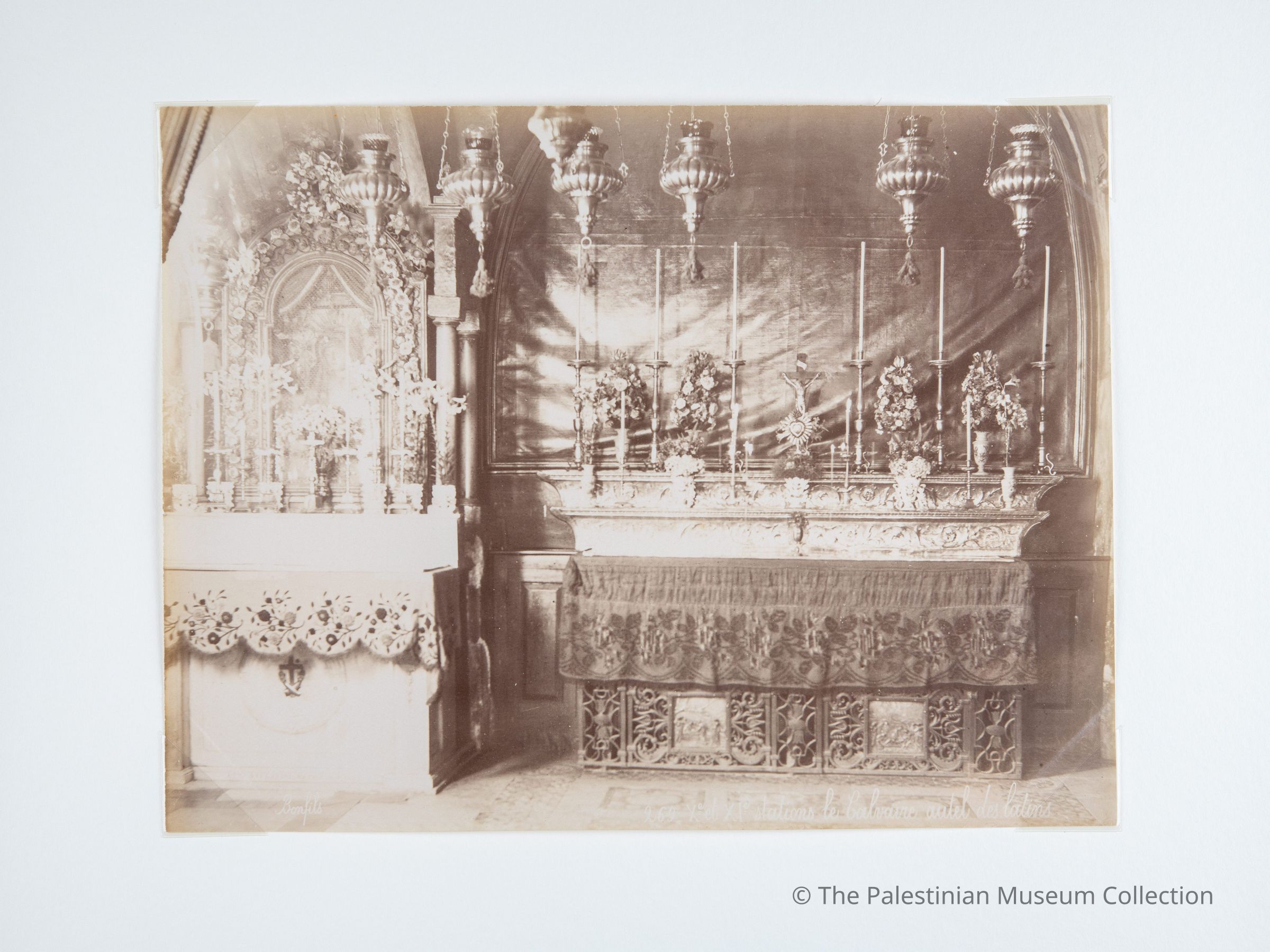 صورة فوتوغرافيّة بالأبيض والأسود، التقطها المصور فيليكس بونفيس في النصف الثاني من القرن التاسع عشر، تُظهر مشهداً داخلياً من كنيسة القيامة في مدينة القدس، تحديداً الجلجثة - المذبح اللاتيني الذي يعبر عن المحطة العاشرة والحادية عشرة من طريق الآلام.