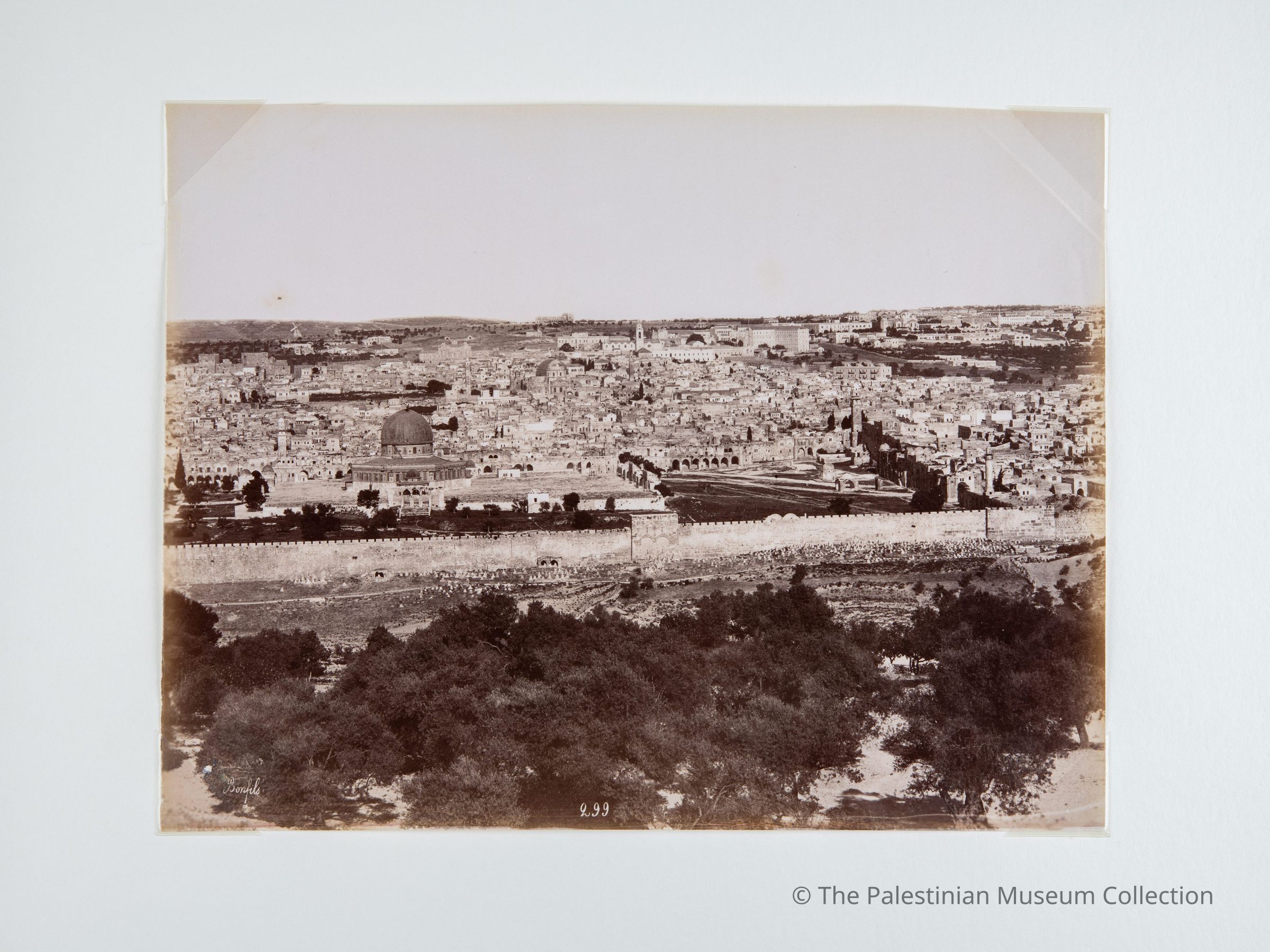 صورة فوتوغرافيّة بالأبيض والأسود، التقطها المصور فيليكس بونفيس في النصف الثاني من القرن التاسع عشر، تُظهر منظراً عاماً لمدينة القدس التقطت من جبل الزيتون، بما يشمل أسوار المدينة، وقبة الصخرة المشرفة، وأشجار الزيتون، والبيوت الحجرية.