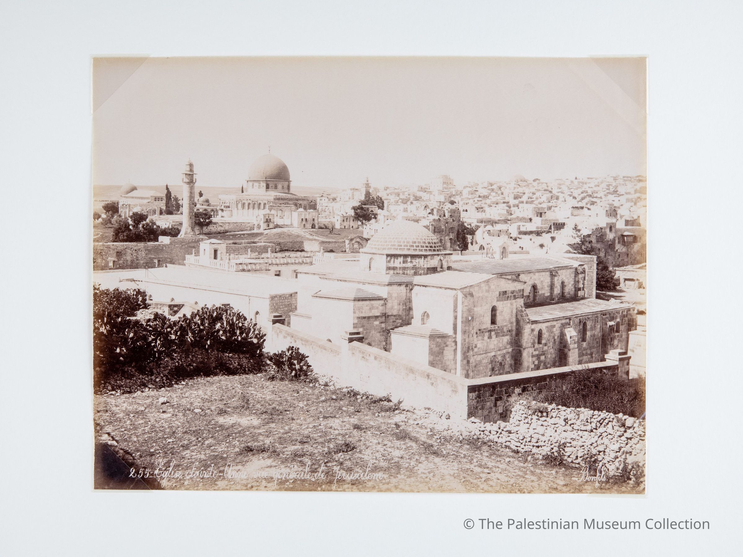 A black-and-white photograph taken by the photographer Felix Bonfils in the second half of the nineteenth century, showing a general view of Jerusalem, including the Church of St. Anne, the Dome of the Rock and stone houses and buildings.Made/Created