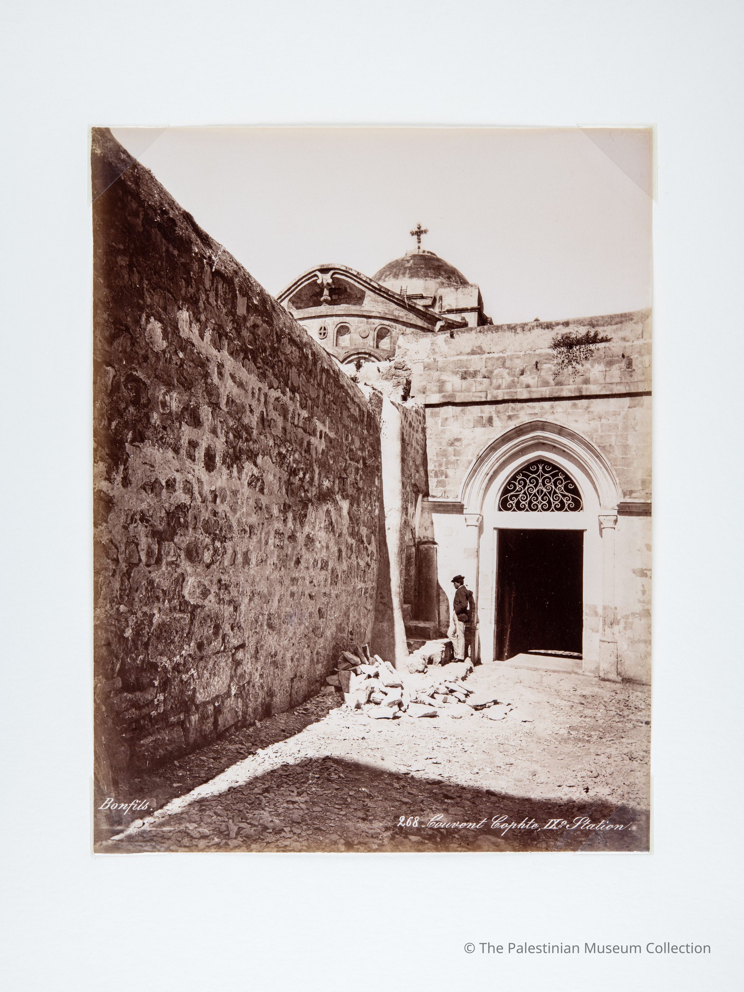 صورة فوتوغرافيّة بالأبيض والأسود، التقطها المصور فيليكس بونفيس في النصف الثاني من القرن التاسع عشر، تُظهر منظراً عاماً لدير الأقباط فوق كنيسة القيامة، ويمكن رؤية قبتها في الخلف. وهذا المكان يعبر عن المحطة التاسعة من طريق الألام.