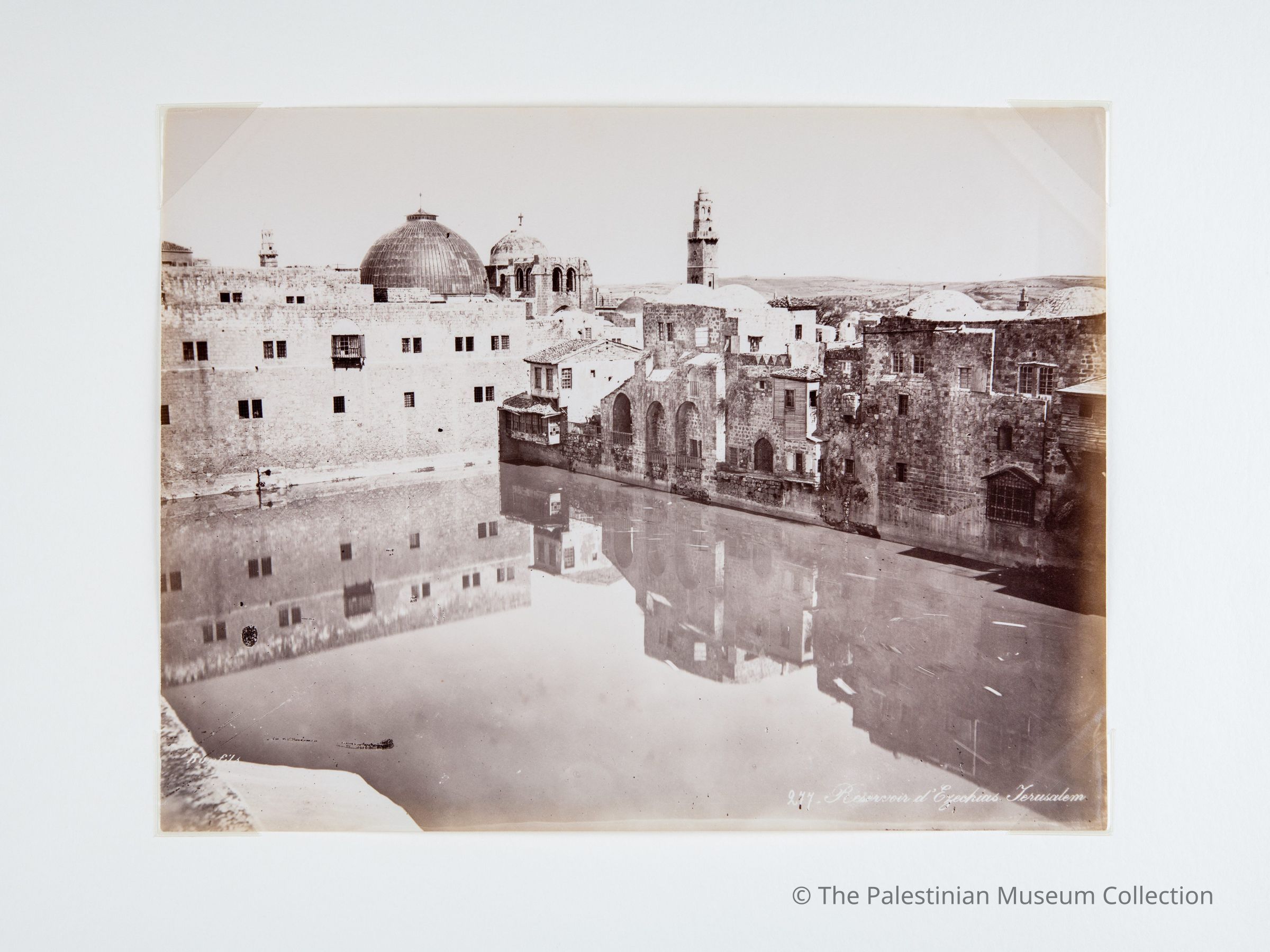 A black-and-white photograph taken by the photographer Felix Bonfils in the second half of the nineteenth century, showing a view of the Hezekiah’s Pool in the Old City of Jerusalem, including the surrounding ancient stone houses and buildings.Made/Created