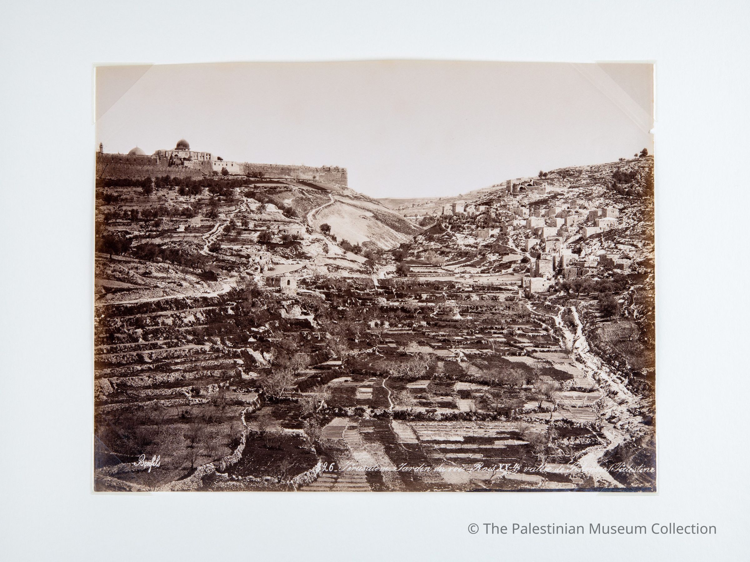 A black-and-white photograph taken by the photographer Felix Bonfils in the second half of the nineteenth century, showing a general view of Al-Bustan Neighborhood in Silwan, with its rugged mountains. Silwan appears on the southern side of the Old City, the Dome of Al-Aqsa (the Qibli Mosque) and part of the Dome of the Rock are visible, too. On the right side of the photo is the Kidron Valley, and on the left is the Hinnom Valley; both meet at En-Nar Valley (Valley of Fire).Made/Created